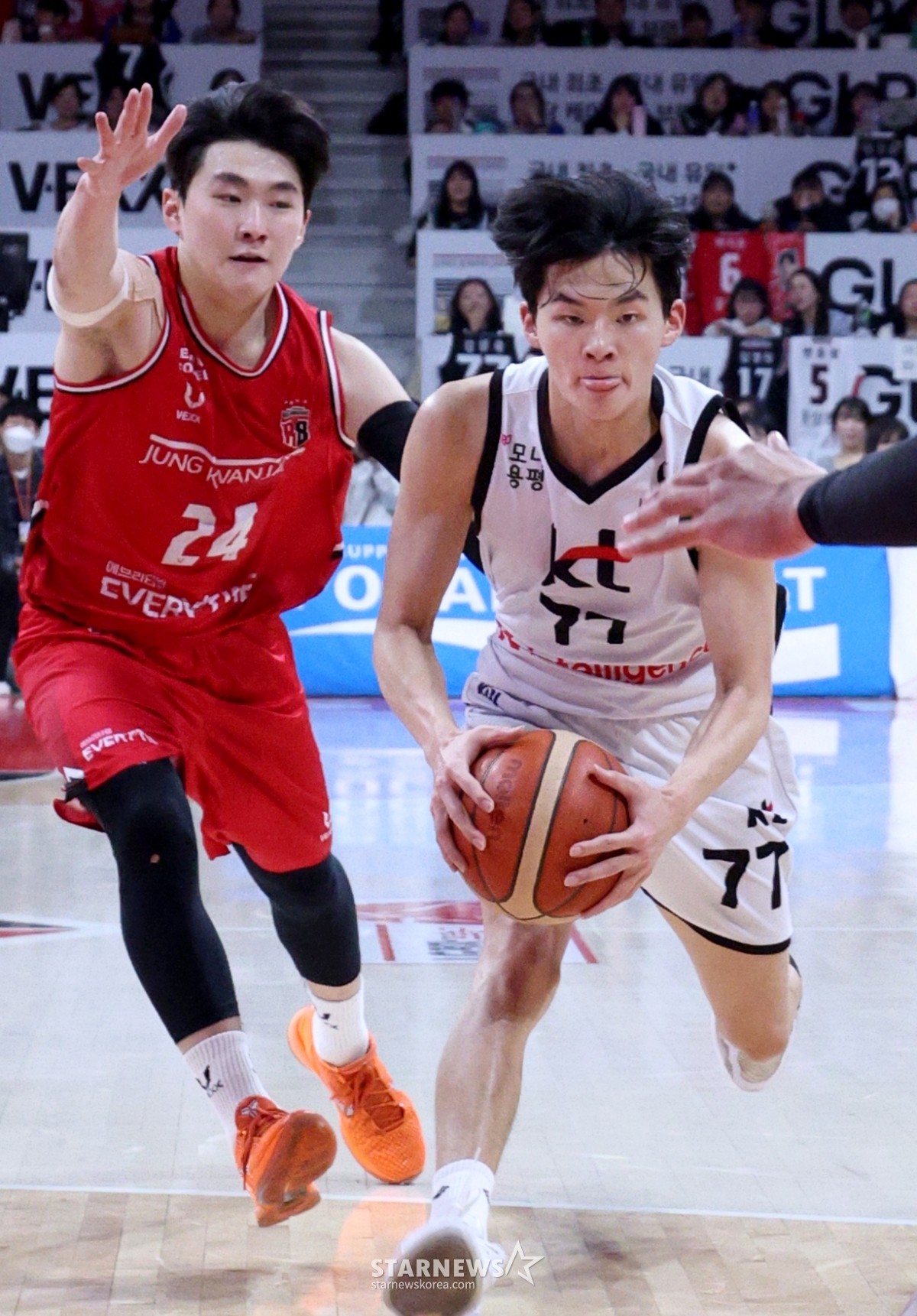 KTのカン·ソンウクが正官庄のムン·ユヒョンを抜いてゴール下に殺到している。