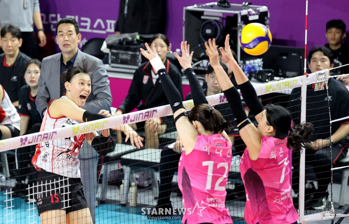 正官庄のイ·ソンウが14日、三山ワールド体育館で開かれた2025-2026ジンエアーVリーグ興国生命と正官庄の試合で興国二重ブロッキングに強打を放っている。 2026.02.14.