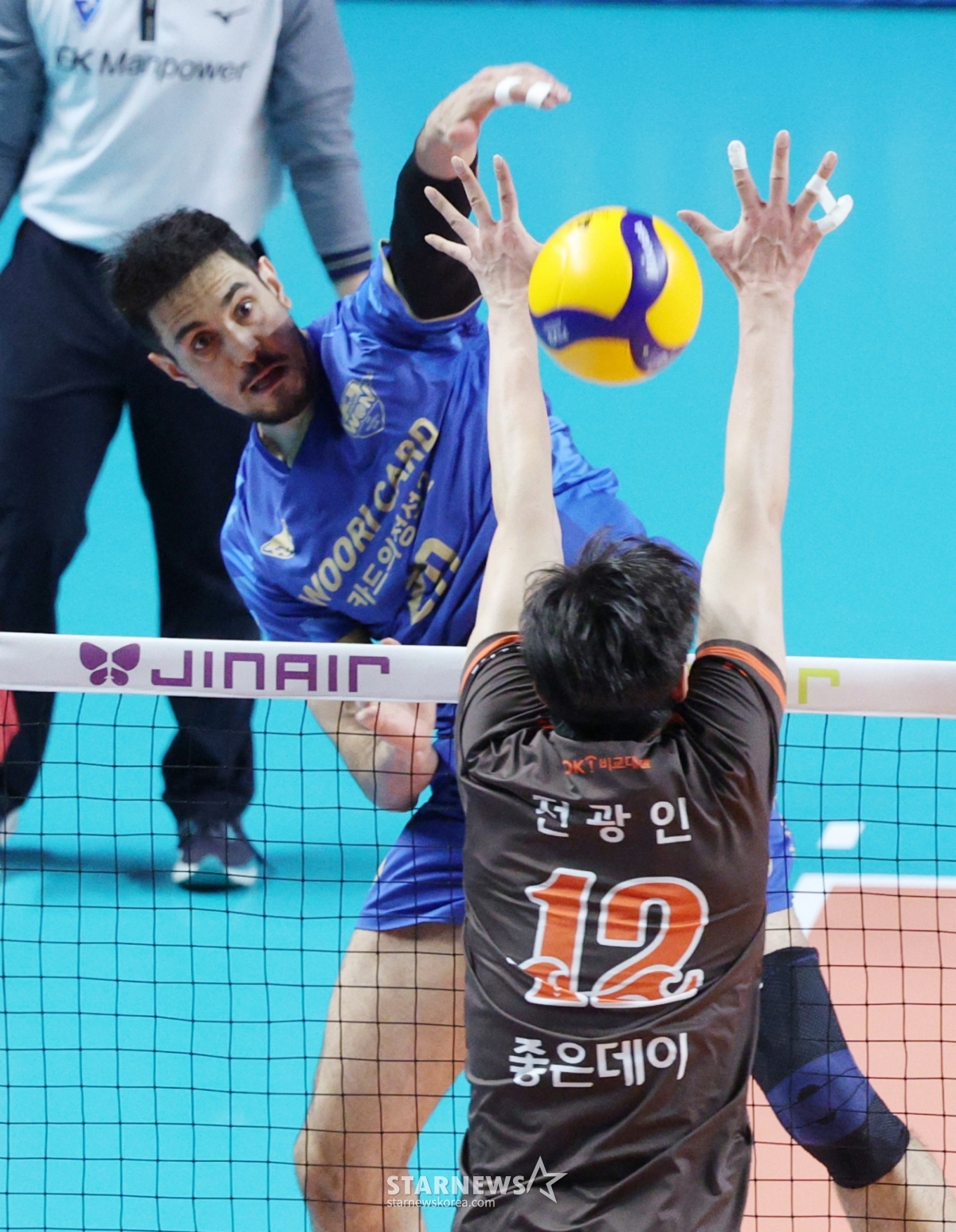 ウリカードのアラウジョがOK貯蓄銀行のチョン·グァンインのブロッキングの上に強烈なスパイクを飛ばしている。