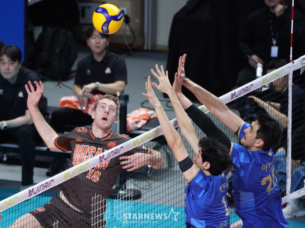 *このコンテンツはAIによって翻訳されました。2025-2026V-リーグ男子部のウリカード対OK貯蓄銀行の試合が15日、ソウル奨忠(チャンチュン)体育館で行われた。OK貯蓄銀行のオーデイがウリィカードのブロッキングの上に連打を放っている。© STARNEWS. 無断転載・再配布禁止*このコンテンツはAIによって翻訳されました。