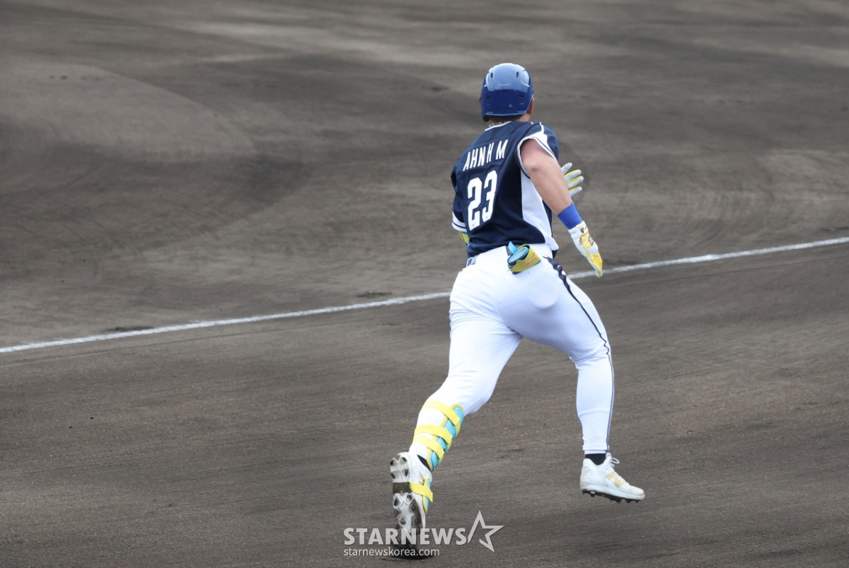 代表チームのアン·ヒョンミンが1回表、三星(サムスン)先発のチェ·ウォンテを相手に1点本塁打を放ち、ダイヤモンドを回っている。