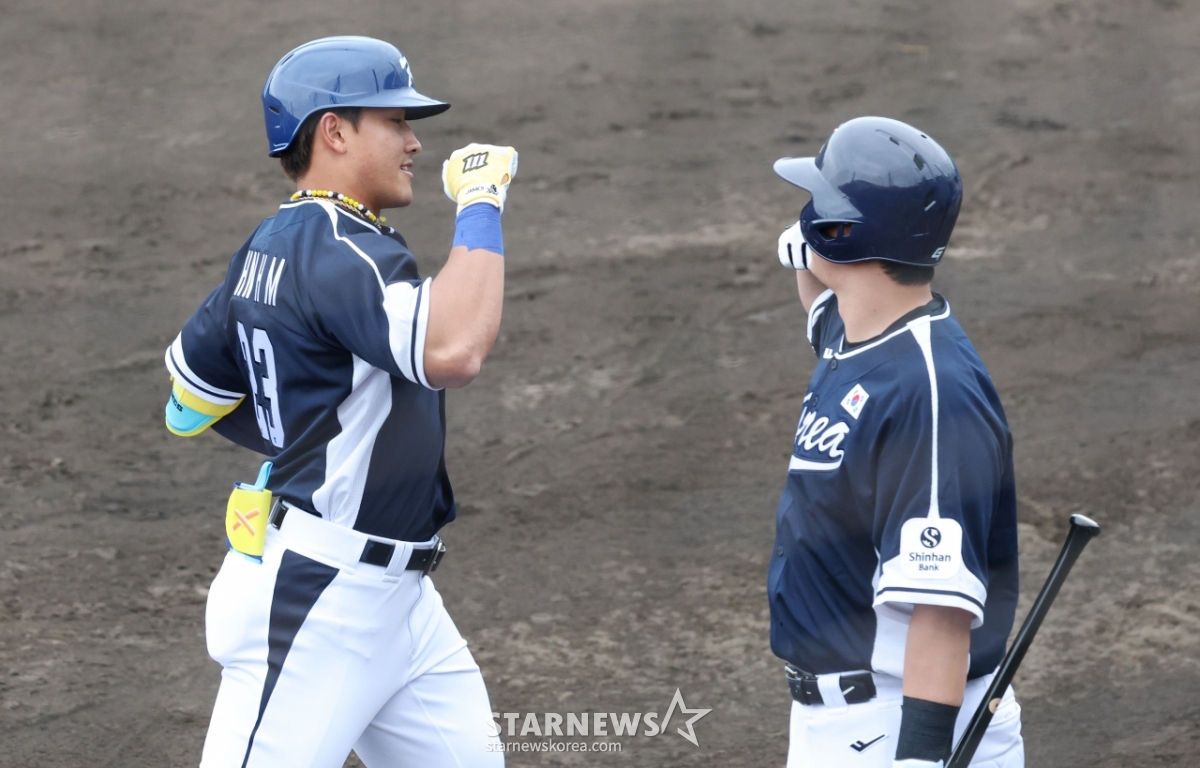 代表チームのアン·ヒョンミンが1回表、三星(サムスン)先発のチェ·ウォンテを相手に1点本塁打を放ち、ホームインしている。