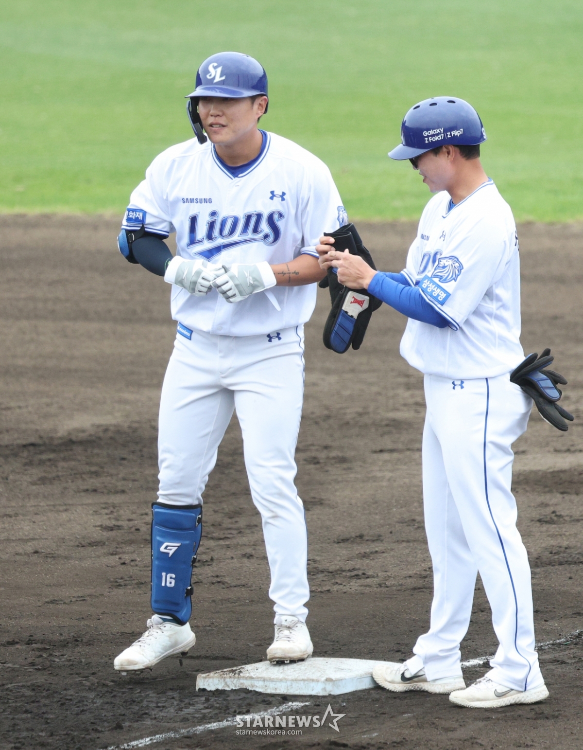 *このコンテンツはAIによって翻訳されました。WBC代表チームが20日、沖縄のオンナソン赤間球場で三星(サムスン)ライオンズと練習試合を行った。三星(サムスン)の柳志赫(リュ·ジヒョク)が5回裏、1打点のタイムリーヒットを放ち、出塁した後、1塁コーチの歓迎を受けている。© STARNEWS. 無断転載・再配布禁止*このコンテンツはAIによって翻訳されました。
