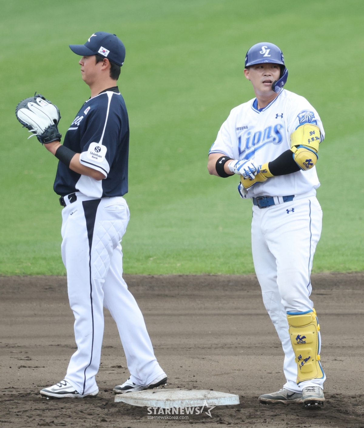 *このコンテンツはAIによって翻訳されました。WBC代表チームが20日、沖縄のオンナソン赤間球場で三星(サムスン)ライオンズと練習試合を行った。三星(サムスン)のチョン·ビョンウが2塁打を放って出塁した後、息を整えている。© STARNEWS. 無断転載・再配布禁止*このコンテンツはAIによって翻訳されました。