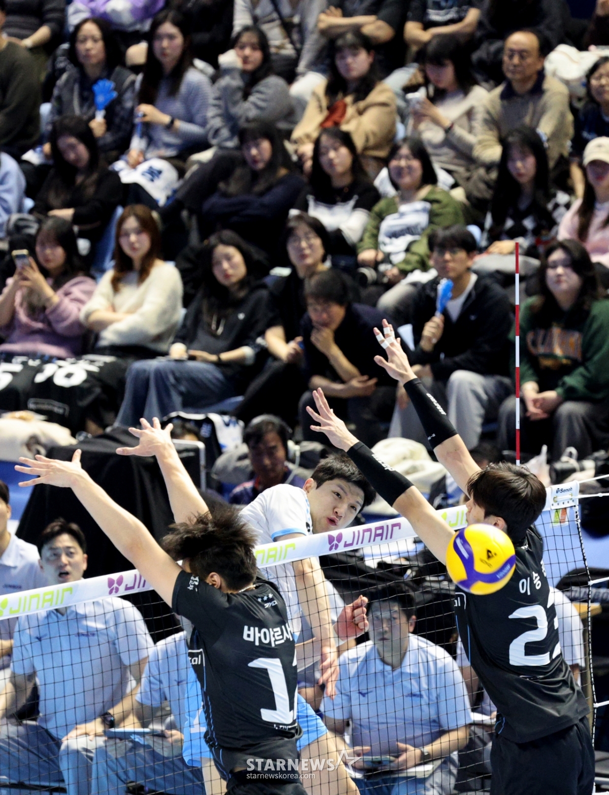 *このコンテンツはAIによって翻訳されました。大韓航空のチョン·ジソクが22日、桂陽体育館で開かれたジンエアー2025-2026Vリーグの大韓航空と現代キャピタルの試合で、現代二重ブローキックを突破している。 2026.02.202.© STARNEWS. 無断転載・再配布禁止*このコンテンツはAIによって翻訳されました。