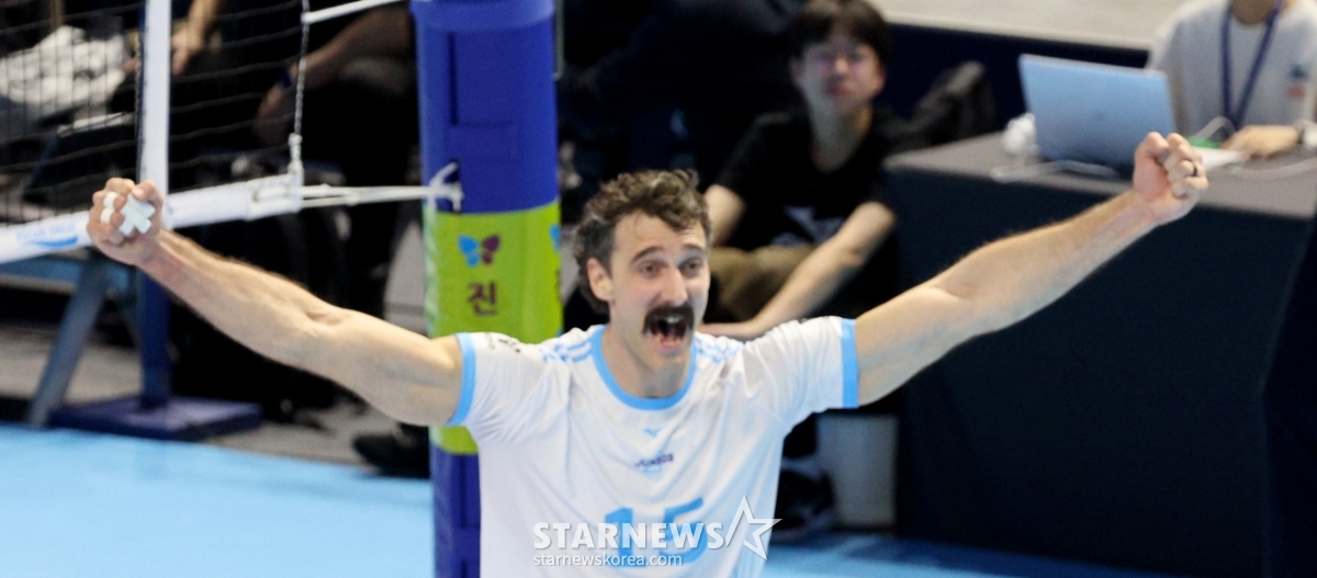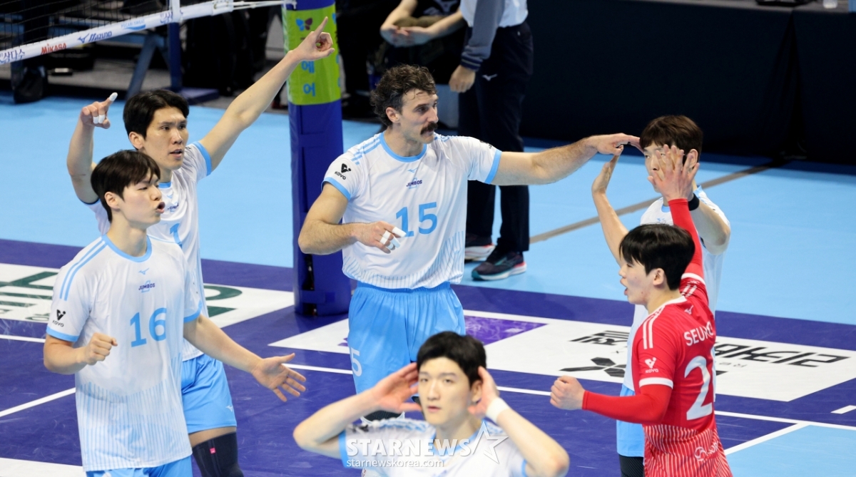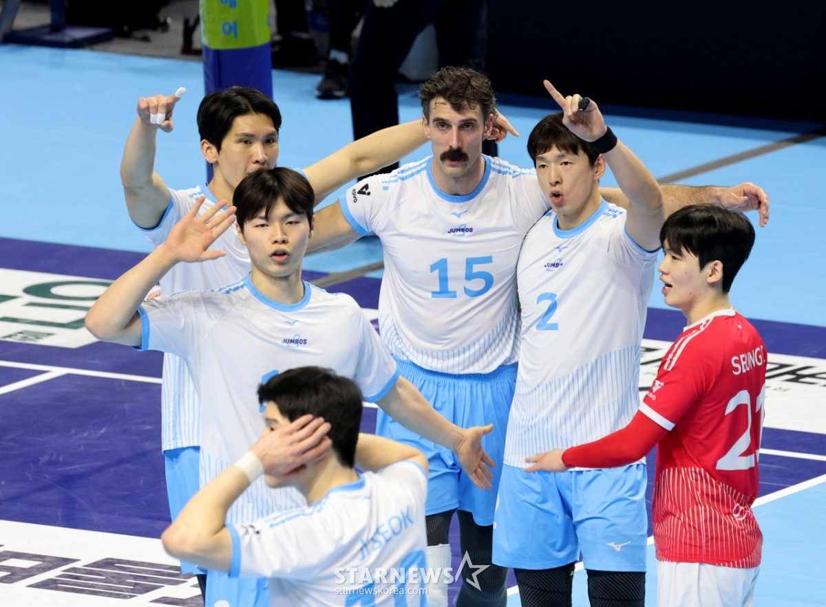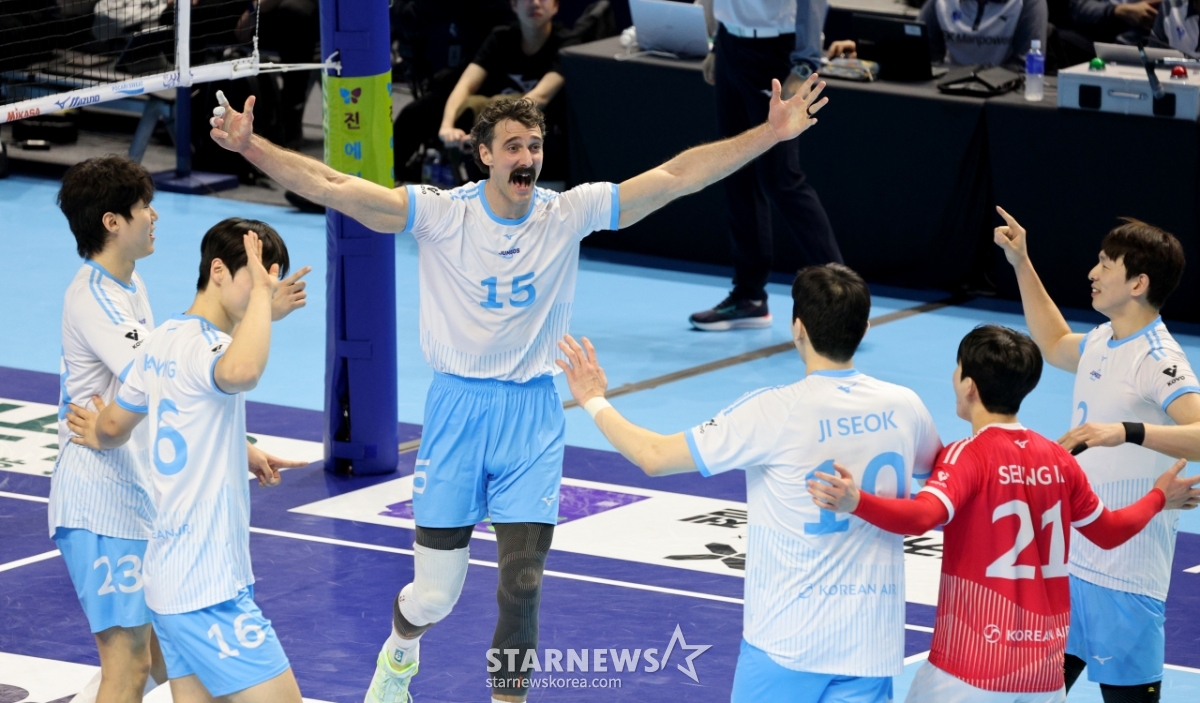 *このコンテンツはAIによって翻訳されました。大韓航空のラッセルと選手たちが22日、桂陽体育館で開かれたジンエアー2025-2026Vリーグの大韓航空と現代キャピタルの試合で得点後、歓呼している。 2026.02.202.© STARNEWS. 無断転載・再配布禁止*このコンテンツはAIによって翻訳されました。