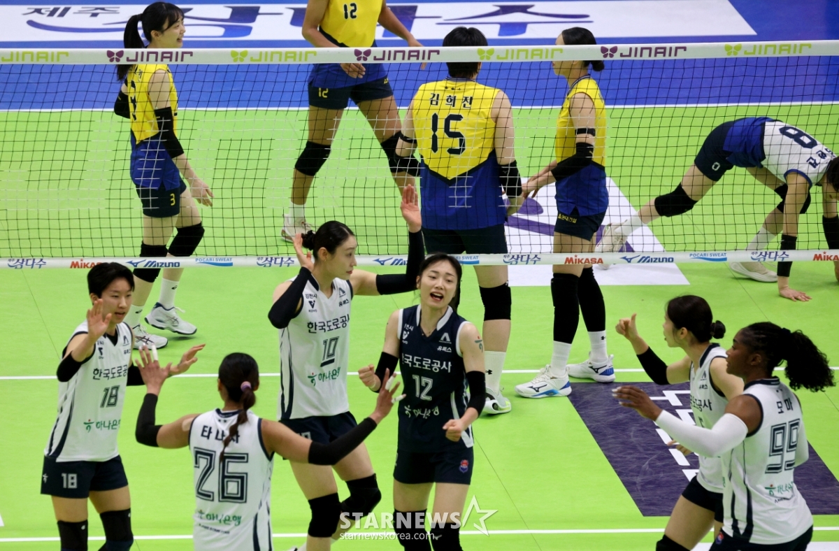 *このコンテンツはAIによって翻訳されました。道路公社の選手たちが24日、水原(スウォン)体育館で行われたジンエアー2025-2026Vリーグ女子部現代(ヒョンデ)建設と韓国道路公社の試合で得点した後、祝っている.. 2026.02.24.© STARNEWS. 無断転載・再配布禁止*このコンテンツはAIによって翻訳されました。