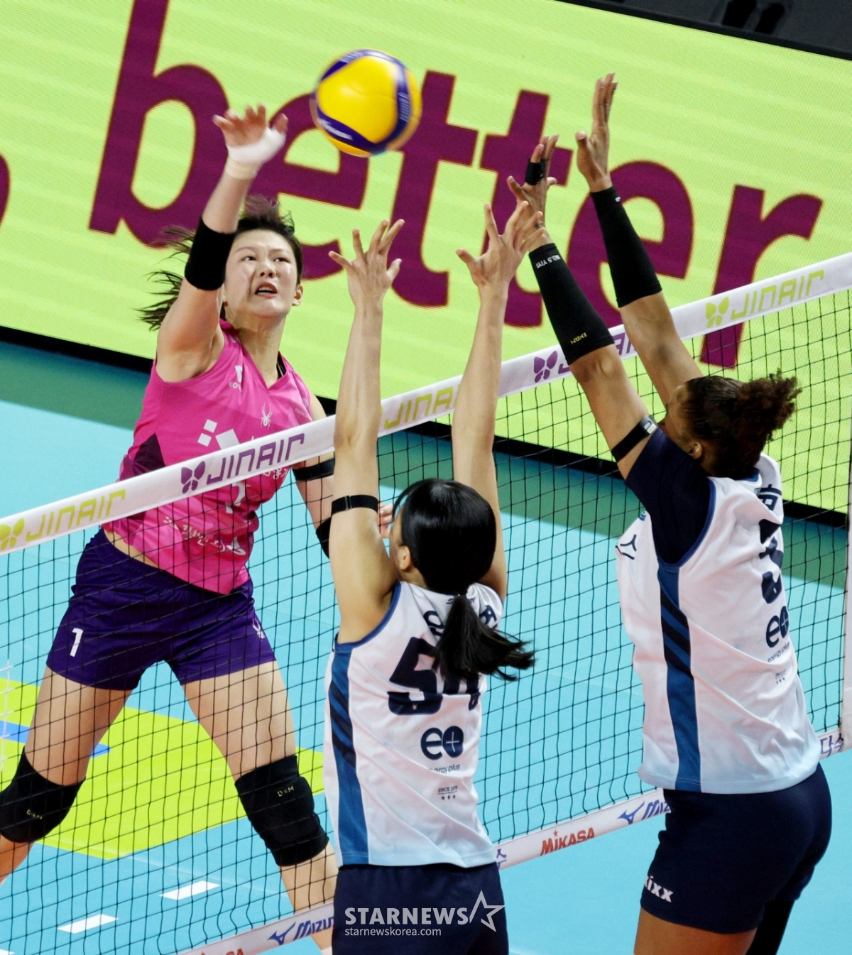 興国のキム·ダウンが26日、三山ワールド体育館で開かれたジンエアー2025-2026Vリーグ女子部の興国生命とGSカルテックスの試合でGSブローキングに強打を放っている。2026.02.26