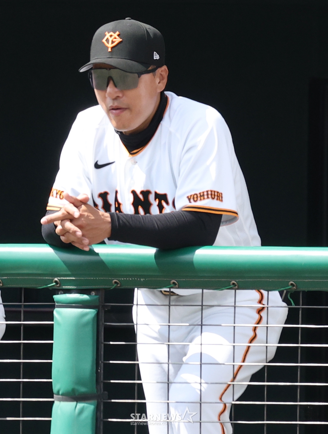 巨人の李承燁(イ·スンヨプ)コーチが試合を見守っている。