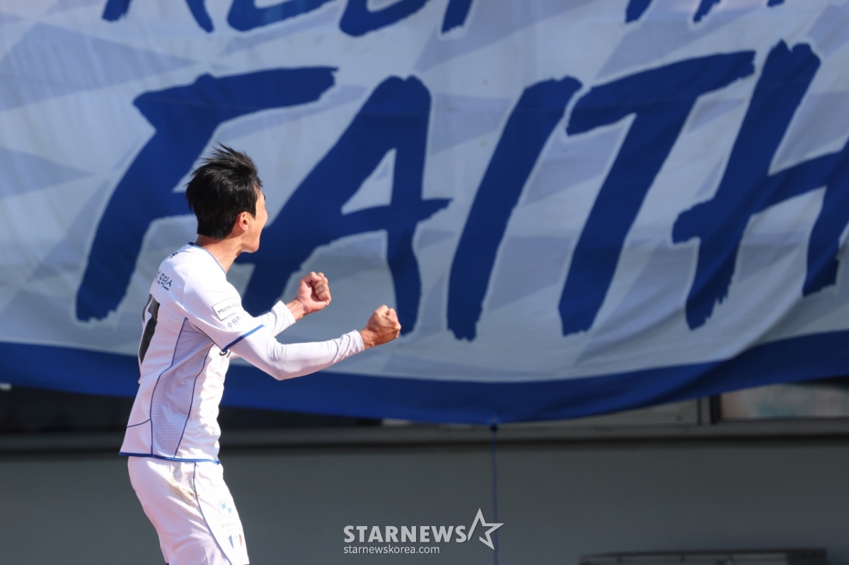 水原三星(スウォン·サムスン)の金ジヒョンがヘザーシュートで初ゴールを決めた後、サポーターズに駆けつけ、喜びを分かち合っている。