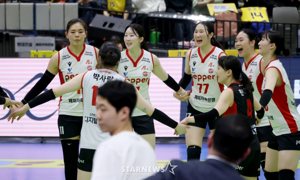 *このコンテンツはAIによって翻訳されました。2025-2026V-リーグ女子部の現代建設対ペッパー貯蓄銀行の試合が8日、京畿道水原体育館で行われた。ペッパー貯蓄銀行の選手たちが3-1で勝利した後、喜んでいる。© STARNEWS. 無断転載・再配布禁止*このコンテンツはAIによって翻訳されました。