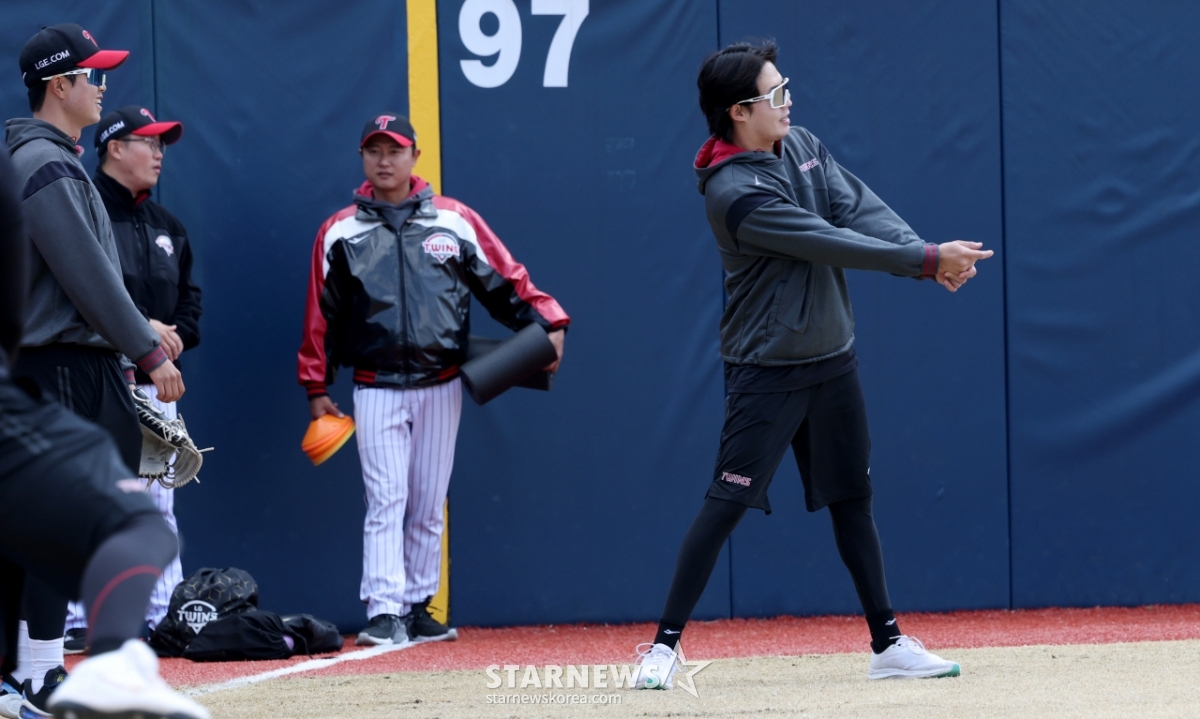 LGのイム·チャンギュが後輩たちのシミュレーションピッチング訓練に打者の役割を果たしている。
