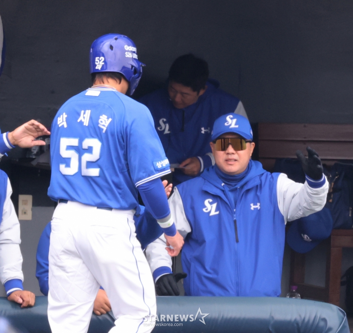 *このコンテンツはAIによって翻訳されました。三星(サムスン)の朴ジンマン監督が15日、利川(イチョン)斗山ベアーズパークで行われた2026プロ野球オープン戦の斗山ベアーズと三星ライオンズの試合で、朴セヒョクの得点を喜んでいる。 2026.03.15.© STARNEWS. 無断転載・再配布禁止*このコンテンツはAIによって翻訳されました。