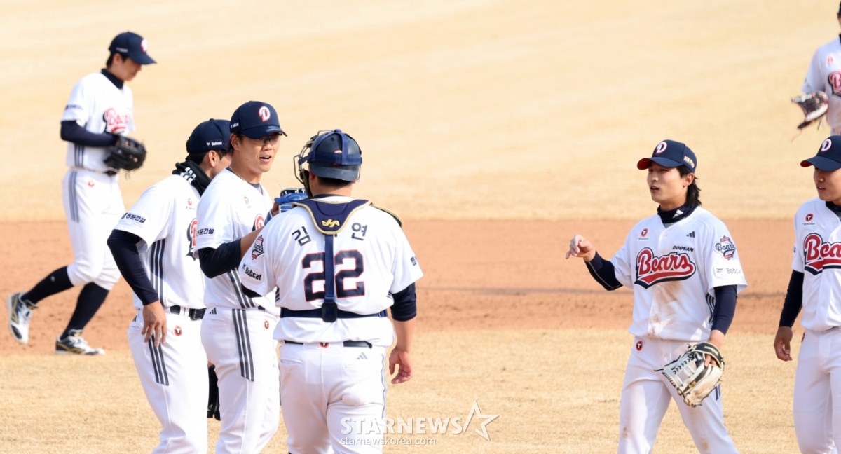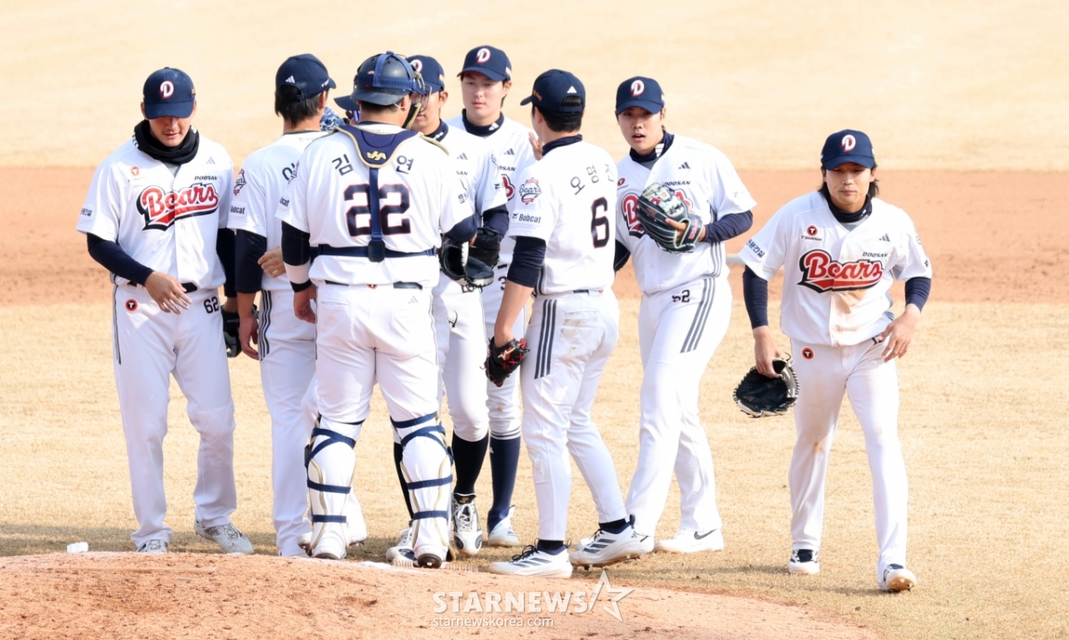 *このコンテンツはAIによって翻訳されました。斗山(トゥサン)の選手たちが15日、利川(イチョン)の斗山ベアーズパークで行われた2026プロ野球オープン戦の斗山ベアーズと三星(サムスン)ライオンズの試合で勝利した後、グラウンドに出ている。 2026.03.15.© STARNEWS. 無断転載・再配布禁止*このコンテンツはAIによって翻訳されました。