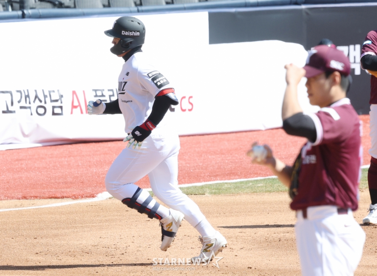 KTのアン·ヒョンミンが1回裏、2社でキウム先発のキム·ユンハを相手に先制左越1点本塁打を放ち、ホームインしている。