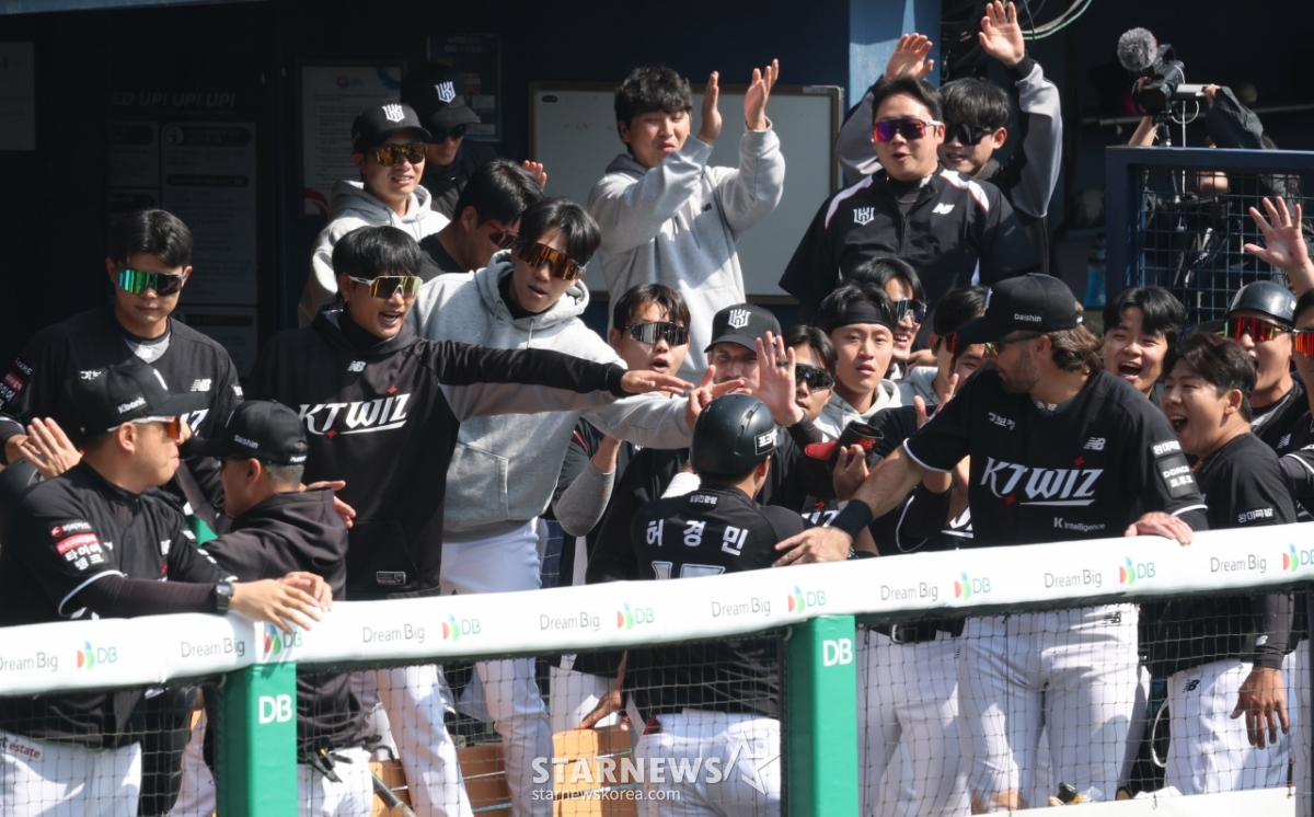 *このコンテンツはAIによって翻訳されました。2026新韓(シンハン)SOLBankKBOリーグ公式開幕戦「LGツインズ対KTウィズ」の試合が28日、ソウル蚕室(チャムシル)野球場で行われた。KTの1回表2死1、2塁で、李カンミンの2打点適時二塁打の時に得点したホ·ギョンミンがダッグアウトで同僚たちの歓迎を受けている。© STARNEWS. 無断転載・再配布禁止*このコンテンツはAIによって翻訳されました。