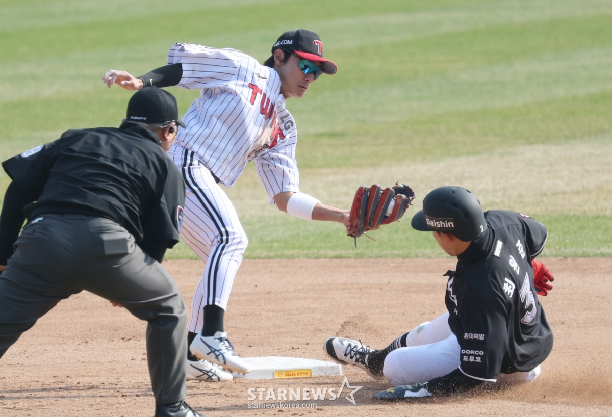 KTの5回表、2死1塁で1塁走者のチェ·ウォンジュンがアン·ヒョンミンの打席の時、2塁盗塁を試みたが、LGの2塁手シン·ミンジェにタグアウトされている。