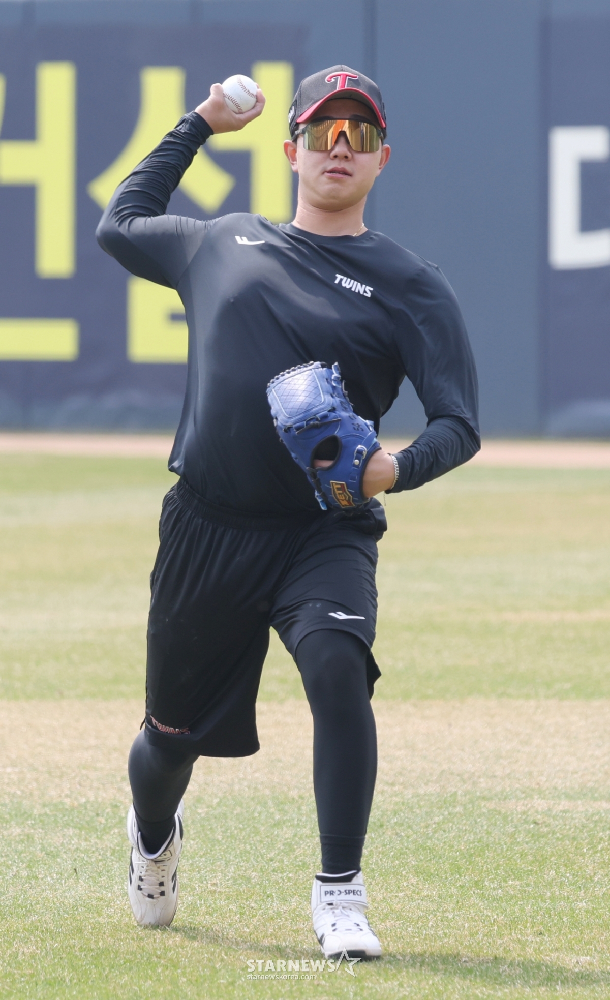 LGのユ·ヨンチャンが外野でピッチング練習をしている。