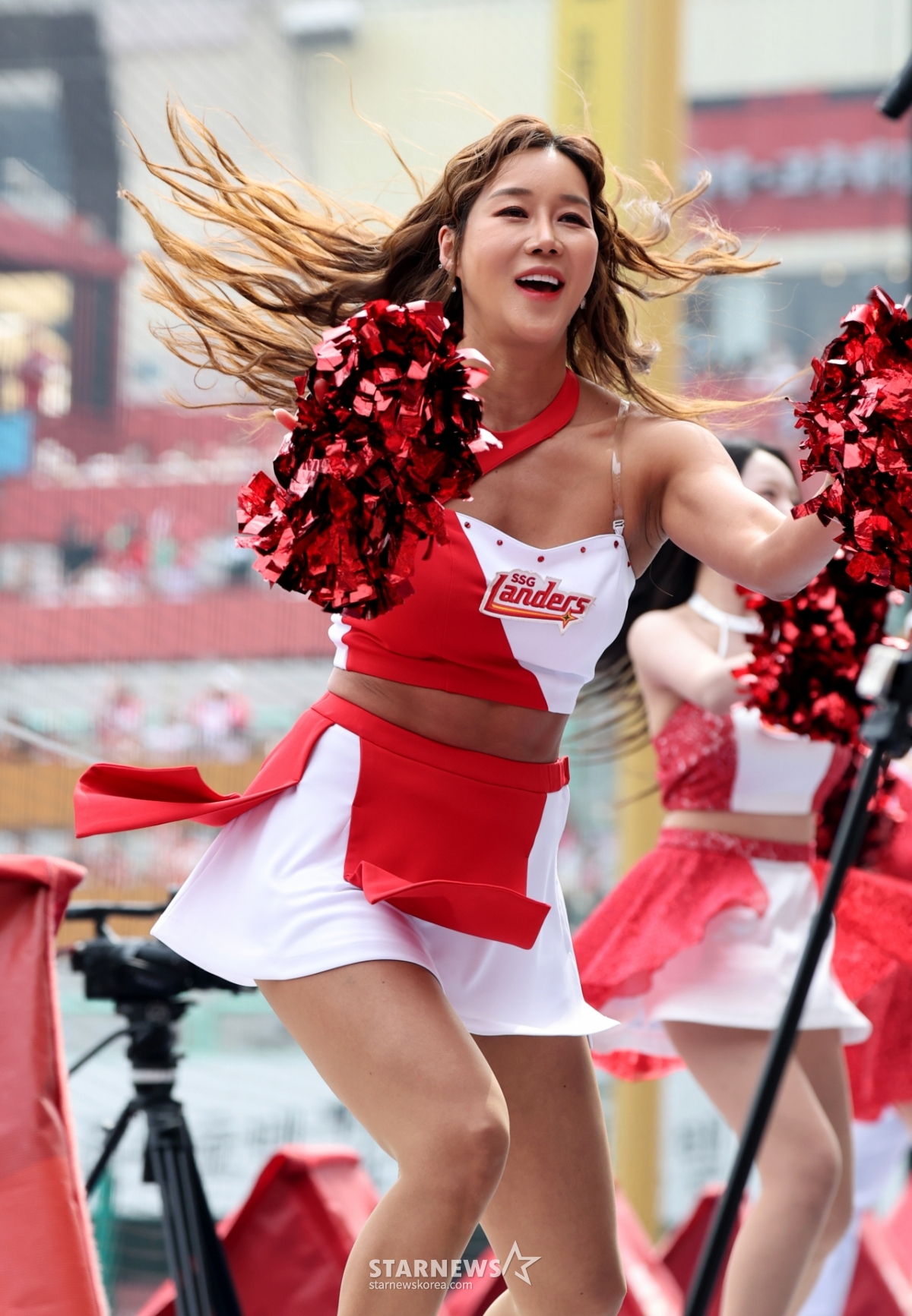 ナイスボディーのチアリーダー、ペ·スヒョンが29日、仁川(インチョン)SSGランダースフィールドで行われる2026プロ野球SSGランダースとKIAタイガースの試合で熱い応援を繰り広げている.. 2026.03.29.