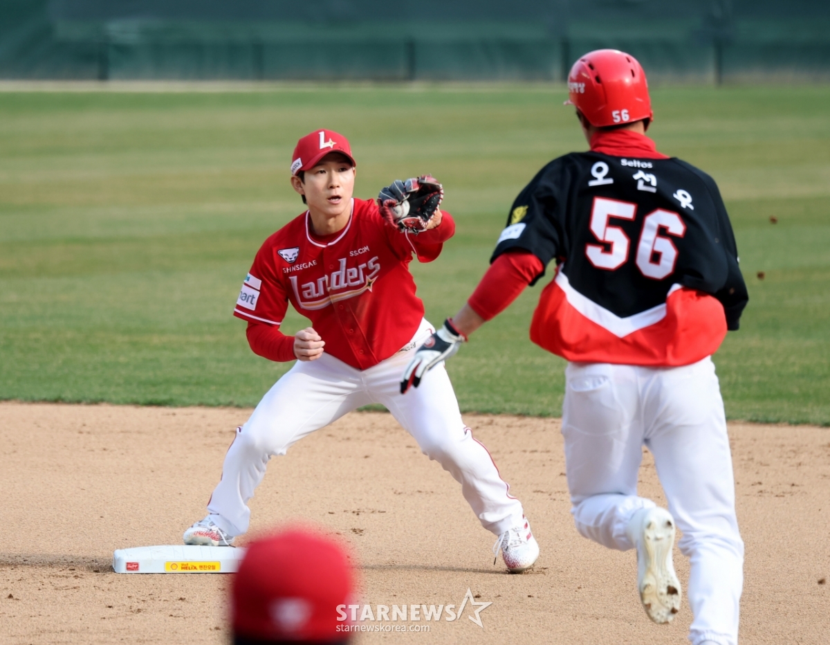 ランダースの朴ソンハンが29日、仁川(インチョン)SSGランダースフィールドで行われる2026プロ野球SSGランダースとKIAタイガースの試合8回表、無死1塁、起亜(キア)8番打者のハン·ジュンス内野ゴロの際、1塁走者のオ·ソンウを2塁フォースアウトさせた後、1塁に送球している。 2026.03.29.