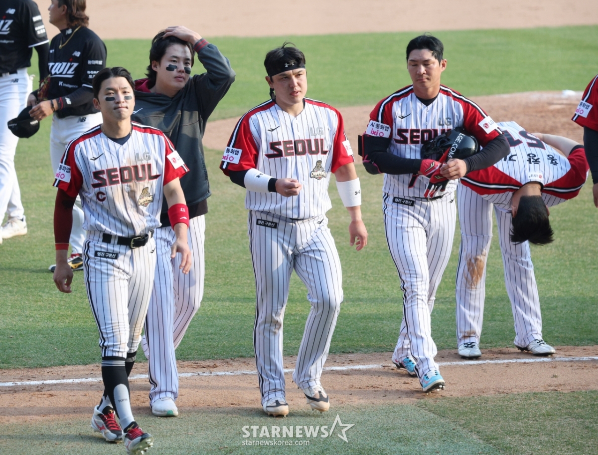 *このコンテンツはAIによって翻訳されました。2026新韓(シンハン)SOLBankKBOリーグLGツインズ対KTウィズの試合が29日、ソウル蚕室(チャムシル)野球場で行われた。LG選手たちがKTに5-6で敗れた後、沈痛な表情でファンに挨拶している。© STARNEWS. 無断転載・再配布禁止*このコンテンツはAIによって翻訳されました。