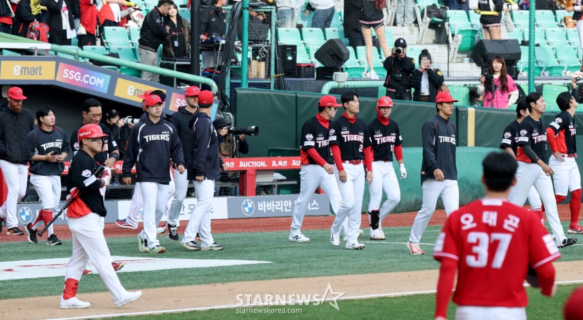 *このコンテンツはAIによって翻訳されました。起亜(キア)選手たちが29日、仁川(インチョン)SSGランダースフィールドで行われる2026プロ野球SSGランダースとKIAタイガースの試合で6-11で敗れ、2連敗した後、グラウンドに出ている。 . 2026.03.29.© STARNEWS. 無断転載・再配布禁止*このコンテンツはAIによって翻訳されました。