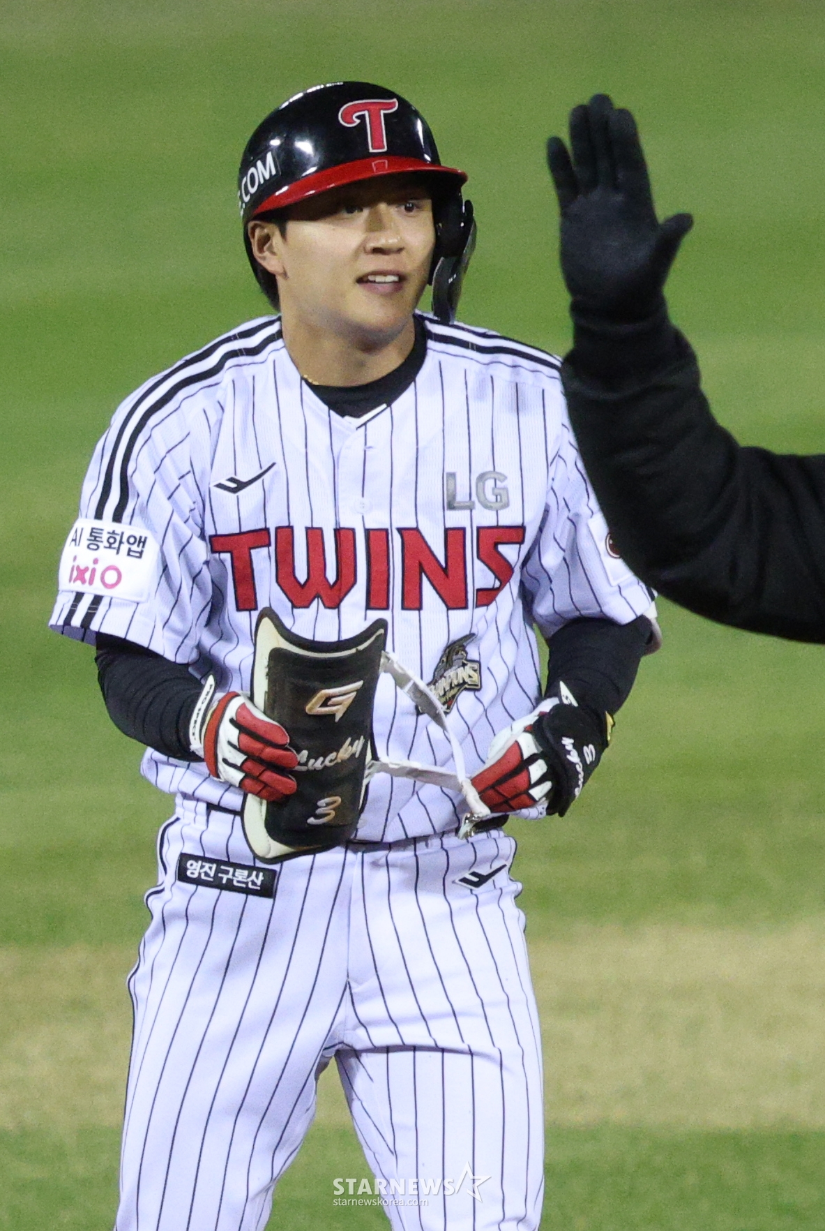 *このコンテンツはAIによって翻訳されました。2026新韓(シンハン)SOLBankKBOリーグLGツインズ対KIAタイガースの試合が31日、ソウル蚕室(チャムシル)野球場で行われた。LGのチェ·ウォニョンが7回裏、2死1、2塁で1打点適時二塁打を放って出塁した後、息を整えている。© STARNEWS. 無断転載・再配布禁止*このコンテンツはAIによって翻訳されました。