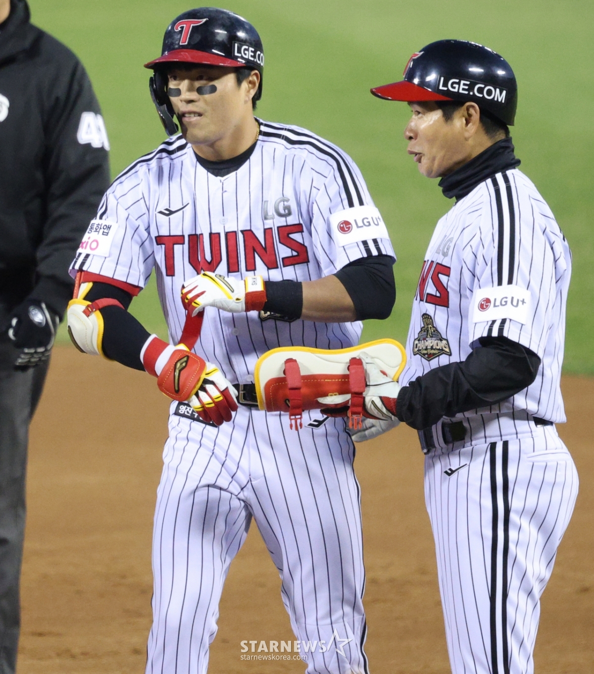 *このコンテンツはAIによって翻訳されました。2026新韓(シンハン)SOLKBOリーグ、LGツインズ対KIAタイガースの試合が2日、ソウル蚕室(チャムシル)野球場で行われた。LGのチョン·ソンホが2回裏、1死1、3塁で同点1打点の適時打を放ち、出塁した後、ソン·ジマンコーチの歓迎を受けている。© STARNEWS. 無断転載・再配布禁止*このコンテンツはAIによって翻訳されました。
