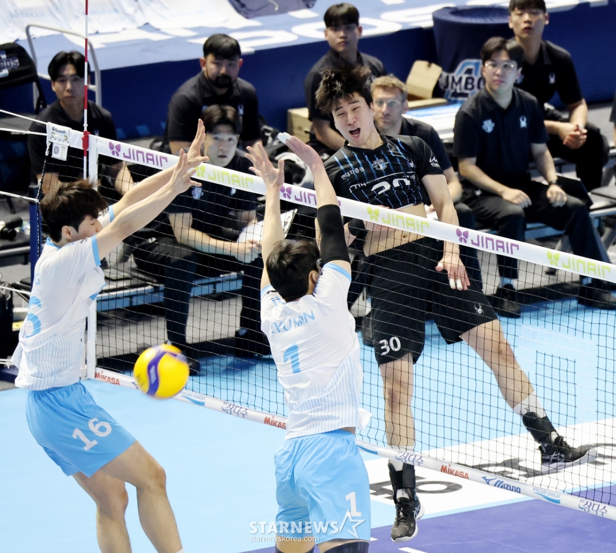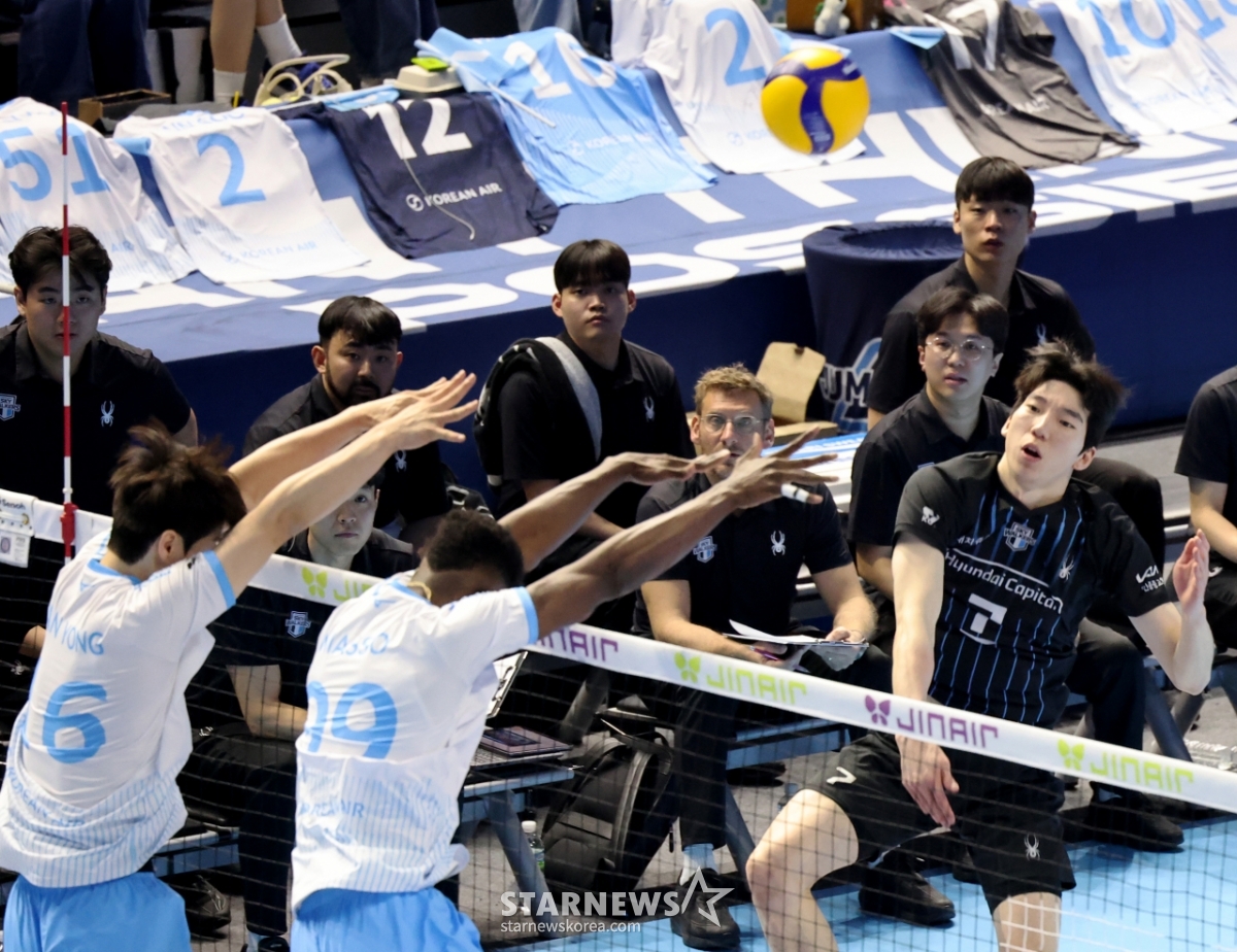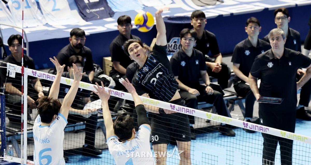*このコンテンツはAIによって翻訳されました。現代のシン·ホジンが3日、桂陽体育館で行われたジンエアー2025-2026Vリーグチャンピオン決定戦の大韓航空と現代キャピタルの試合で、大韓航空のブロッキングに攻撃を成功させている。 2026.04.03.© STARNEWS. 無断転載・再配布禁止*このコンテンツはAIによって翻訳されました。