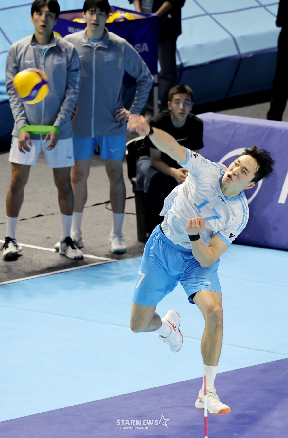 大韓航空のイム·ドンヒョクが3日、桂陽体育館で行われたジンエアー2025-2026Vリーグチャンピオン決定戦の大韓航空と現代キャピタルの試合で、強力なスパイクサーブを試みている。 2026.04.03.