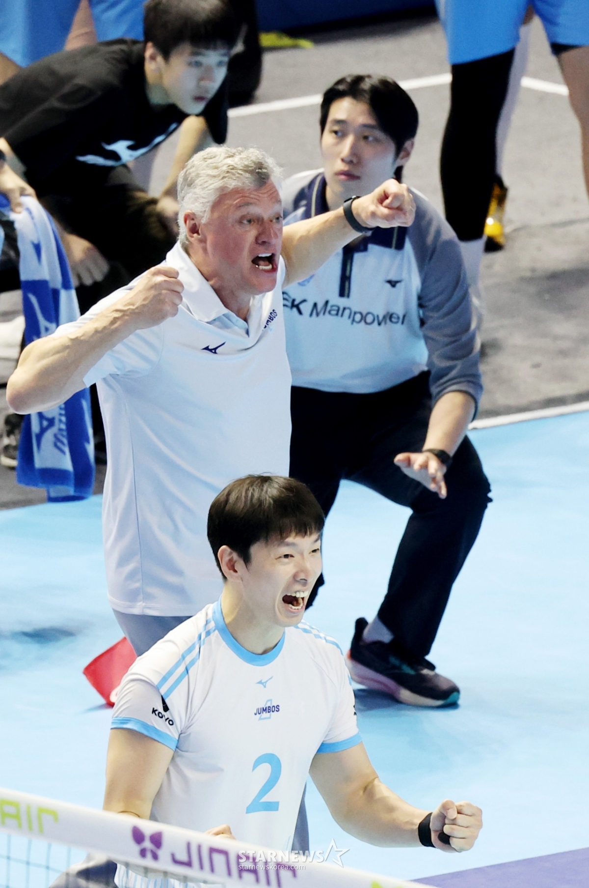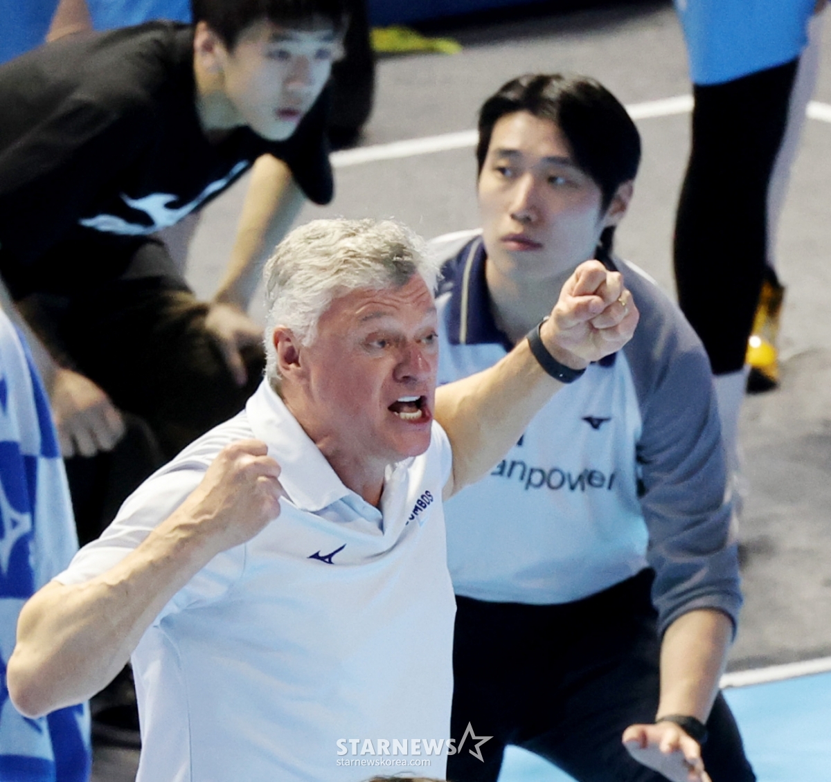 大韓航空のヘナン監督が3日、桂陽体育館で行われたジンエアー2025-2026Vリーグチャンピオン決定戦の大韓航空と現代キャピタルの試合で歓呼している。 2026.04.03.