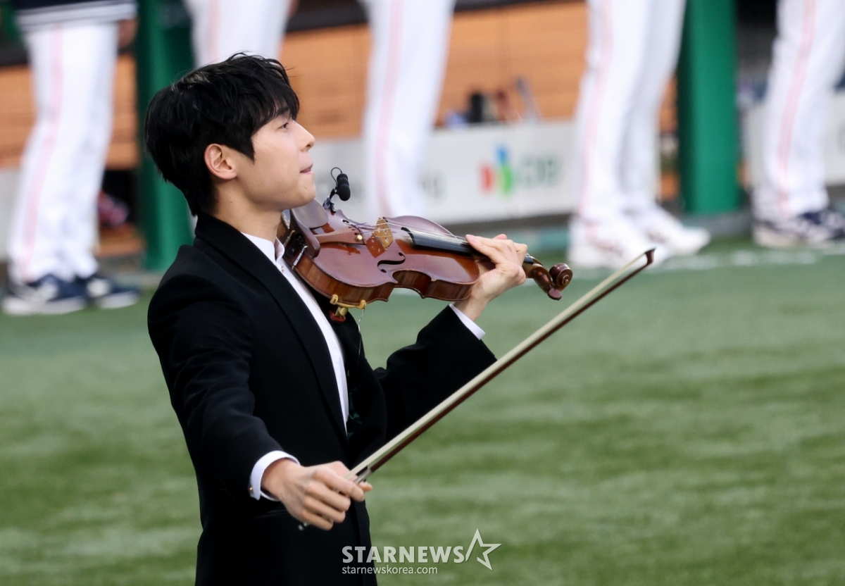 *このコンテンツはAIによって翻訳されました。2026新韓(シンハン)SOLKBOリーグの斗山(トゥサン)ベアーズ対ハンファ·イーグルスの試合が3日、ソウル蚕室(チャムシル)野球場で行われた。バイオリニストのダニー·グー(Danny Koo)が試合前に愛国歌を演奏している。© STARNEWS. 無断転載・再配布禁止*このコンテンツはAIによって翻訳されました。