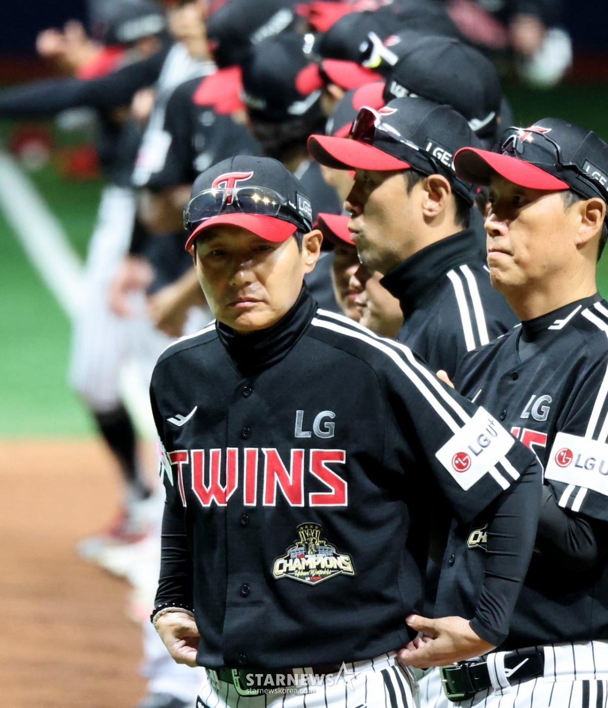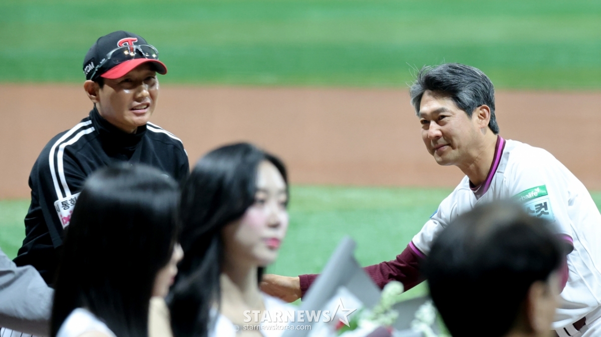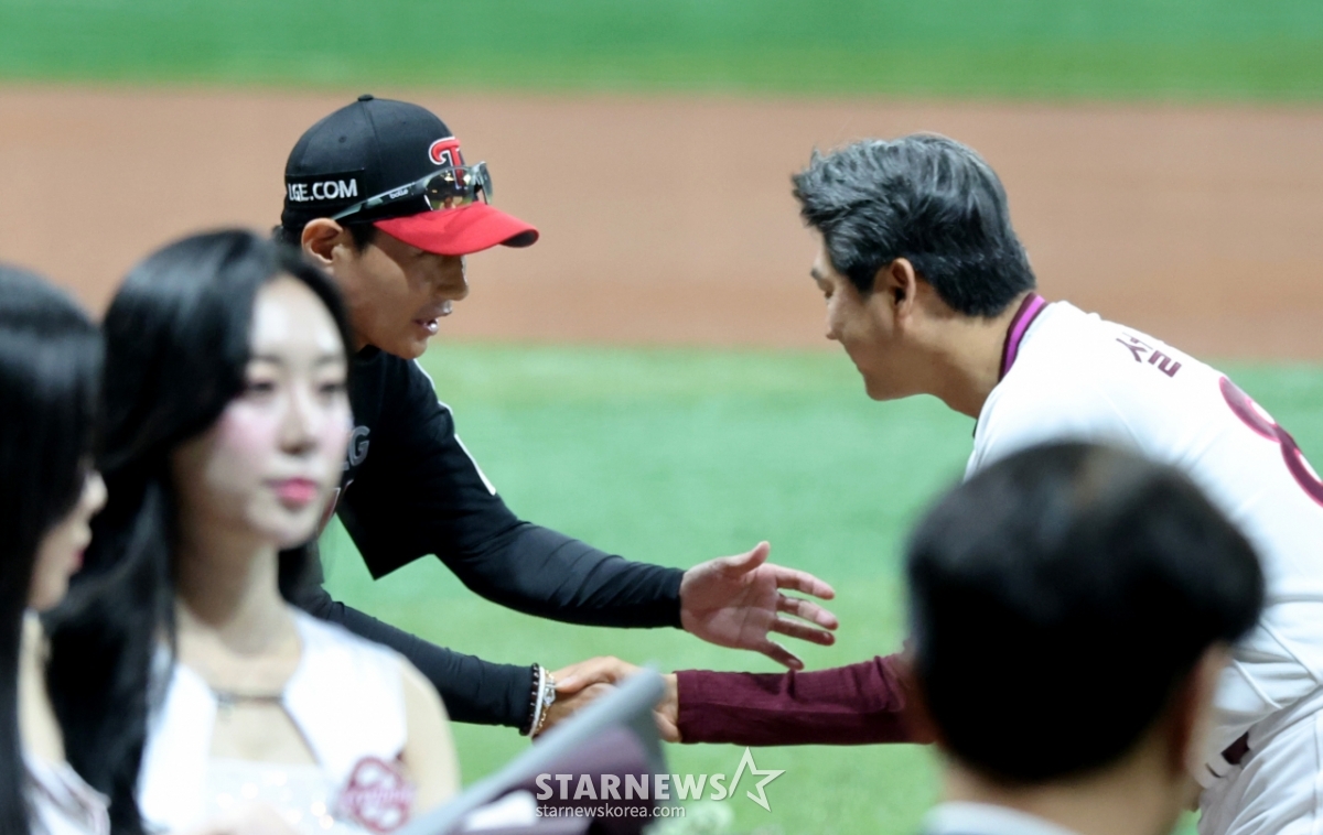 *このコンテンツはAIによって翻訳されました。LGのヨム·ギョンヨプ監督とキウムのソル·ジョンジン監督が4日、高尺スカイドームで開かれた2026KBOリーグのキウムヒーローズとLGツインズの試合を控え、高尺開幕式に参加し、握手を交わしている。 2026.04.03.© STARNEWS. 無断転載・再配布禁止*このコンテンツはAIによって翻訳されました。