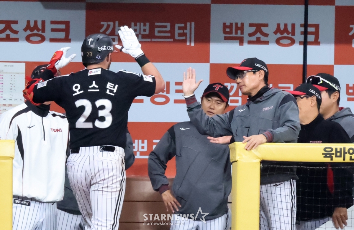*このコンテンツはAIによって翻訳されました。LGの4番打者オースティンが4日、与尺スカイドームで開かれた2026KBOリーグのキウムヒーローズとLGツインズの試合4回表、アルカンタラを相手に追撃ソロホームランを放った後、ヨム·ギョンヨプ監督の祝福を受けている。 202604.03.© STARNEWS. 無断転載・再配布禁止*このコンテンツはAIによって翻訳されました。