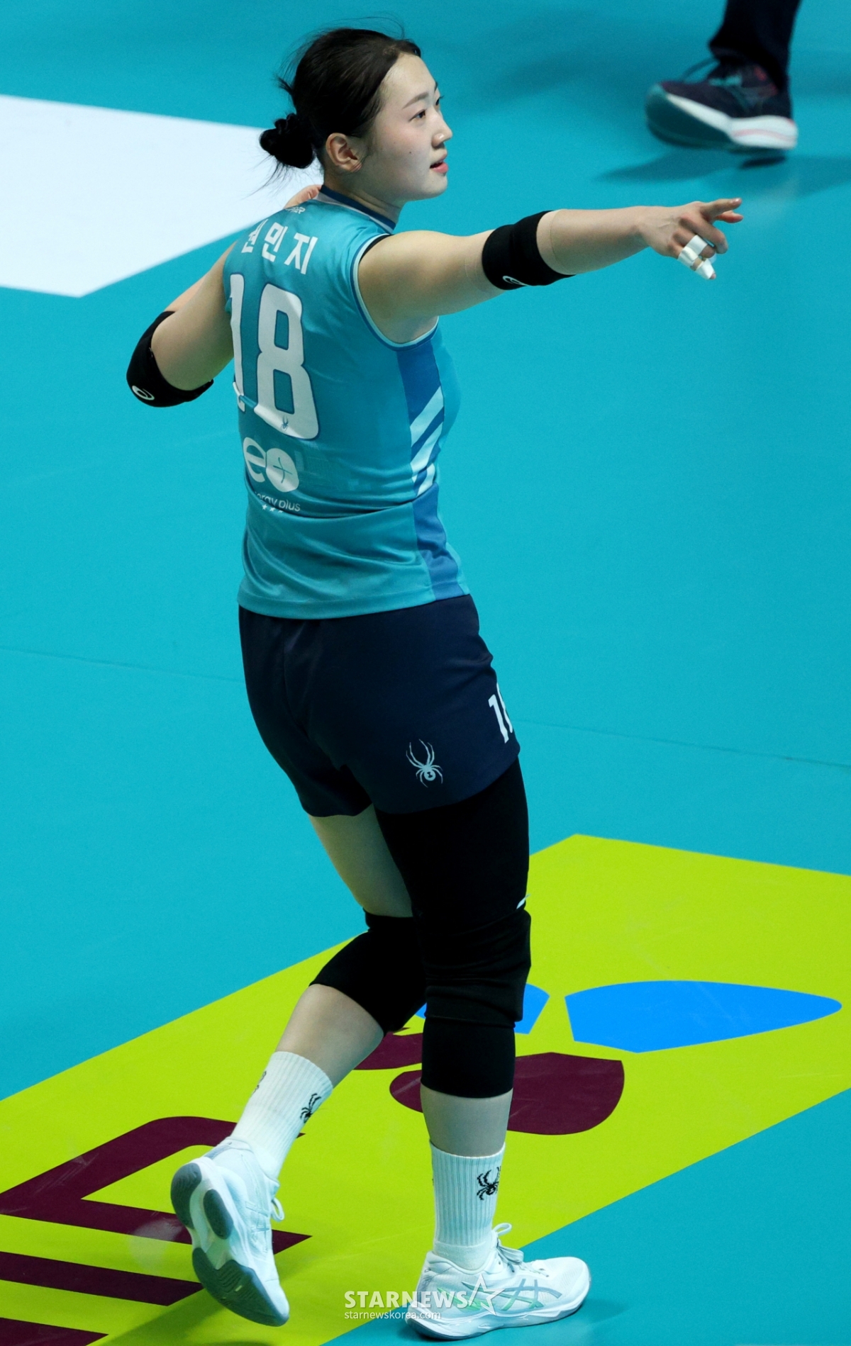 GSカルテックスのクォン·ミンジが決定的なブロッキングに成功した後、セレモニーをしている。