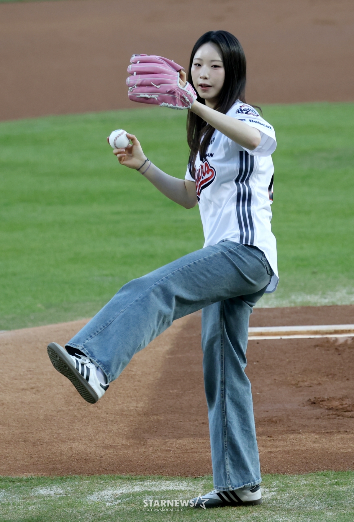 スピードスケート国家代表のイム·リウォンが斗山の勝利祈願の始球式をしている。