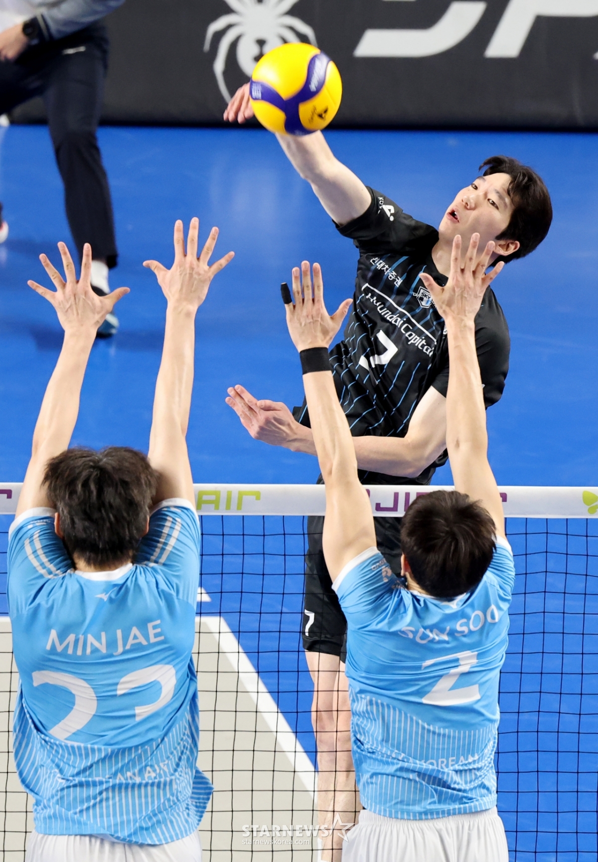 現代(ヒョンデ)の許秀鳳(ホ·スボン)が8日、天安(チョンアン)ユ·グァンスン体育館で行われたジンエアー2025-2026Vリーグチャンピオン決定戦の大韓航空と現代キャピタル第4戦で、大韓航空の二重ブロムキングウィロー攻撃を成功させている。 2026.04.08.