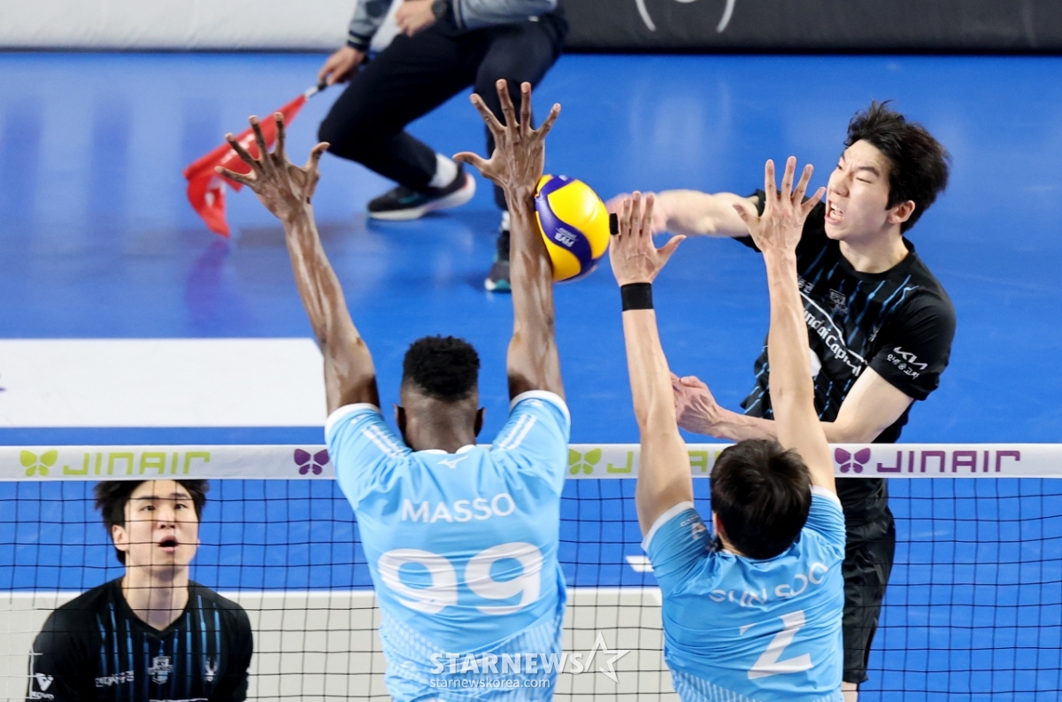 現代(ヒョンデ)の許秀鳳(ホ·スボン)が8日、天安(チョンアン)ユ·グァンスン体育館で行われたジンエアー2025-2026Vリーグチャンピオン決定戦の大韓航空と現代キャピタル第4戦で、大韓航空の二重ブロムキングウィロー攻撃を成功させている。 2026.04.08.