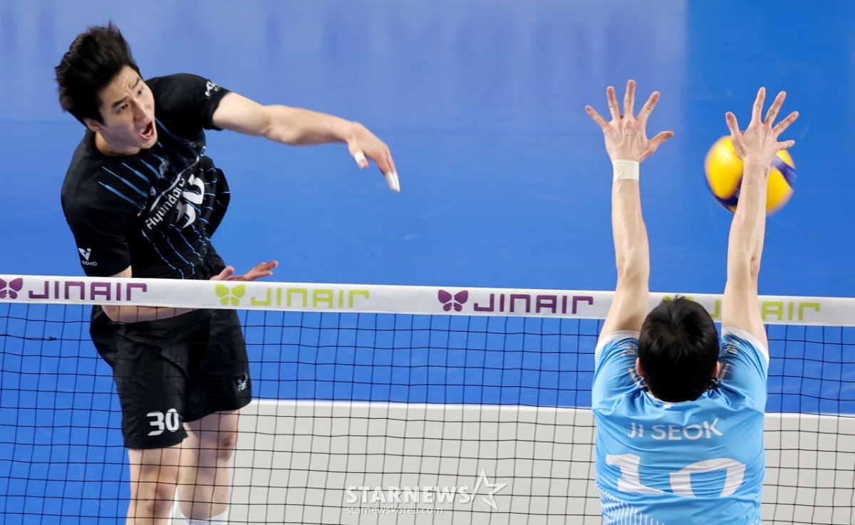 現代(ヒョンデ)のシン·ホジンが8日、天安(チョンアン)の柳寛順(ユ·グァンスン)体育館で行われたジンエアー2025-2026Vリーグチャンピオン決定戦の大韓航空と現代キャピタル第4戦で、強打を放っている。 2026.04.08.