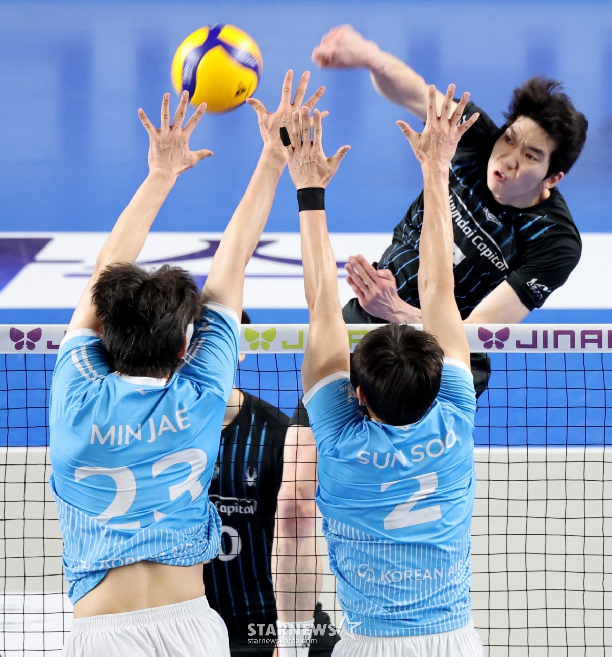 現代(ヒョンデ)の許秀鳳(ホ·スボン)が8日、天安(チョンアン)の柳寛順(ユ·グァンスン)体育館で行われたジンエアー2025-2026Vリーグチャンピオン決定戦の大韓航空と現代キャピタル第4戦で、強打を放っている。 2026.04.08.
