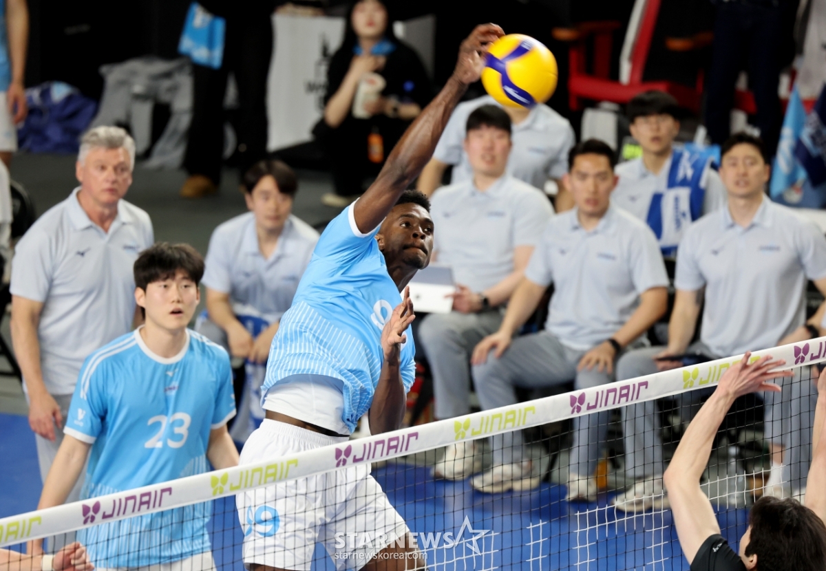 大韓航空のマッソが8日、天安(チョンアン)ユ·グァンスン体育館で行われたジンエアー2025-2026Vリーグチャンピオン決定戦の大韓航空と現代キャピタル第4戦で速攻を試みている。 2026.04.08.