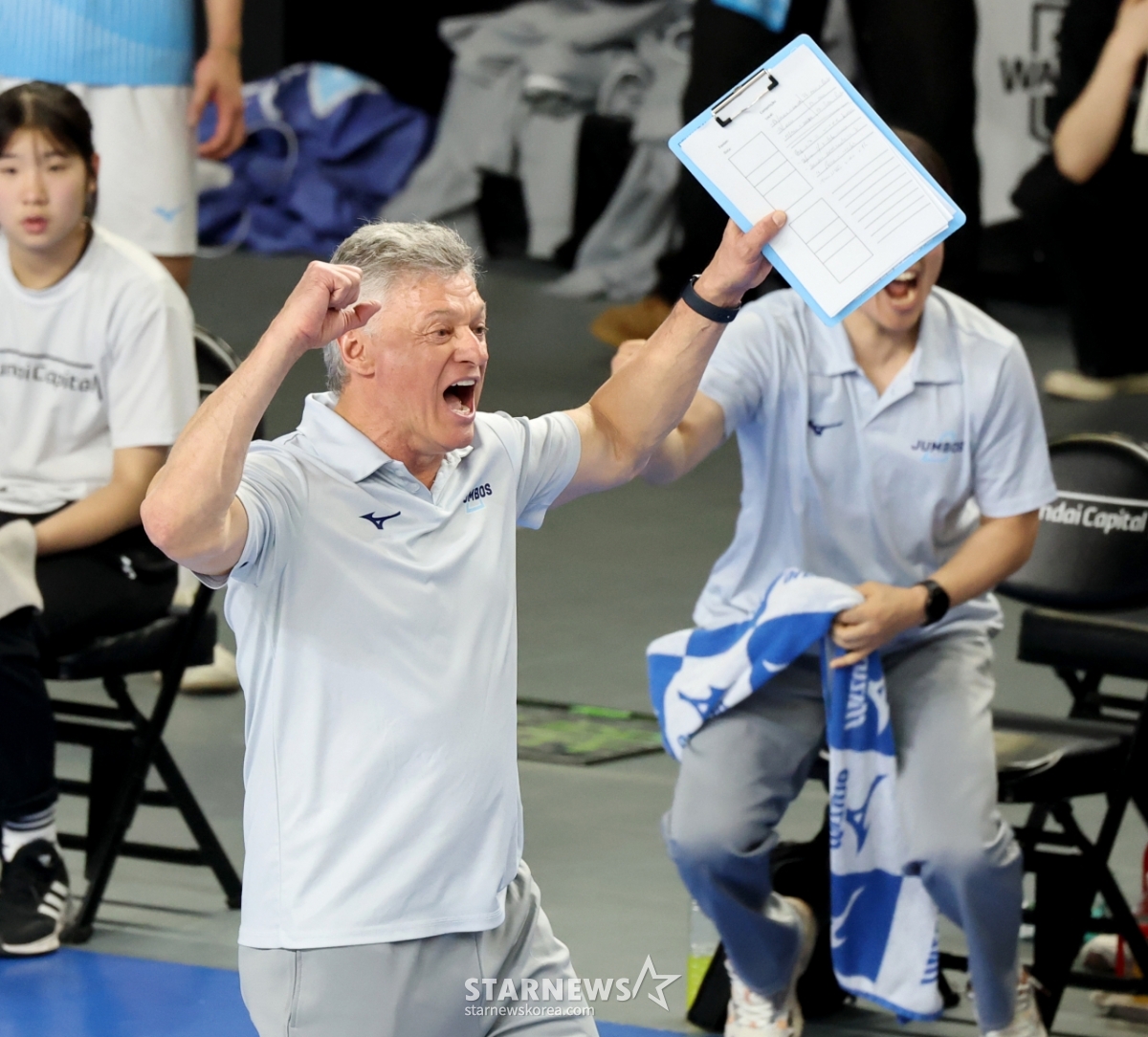 大韓航空のヘナン監督が8日、天安(チョンアン)ユ·グァンスン体育館で行われたジンエアー2025-2026Vリーグチャンピオン決定戦の大韓航空と現代キャピタル第4戦で得点に歓呼している。 2026.04.08.