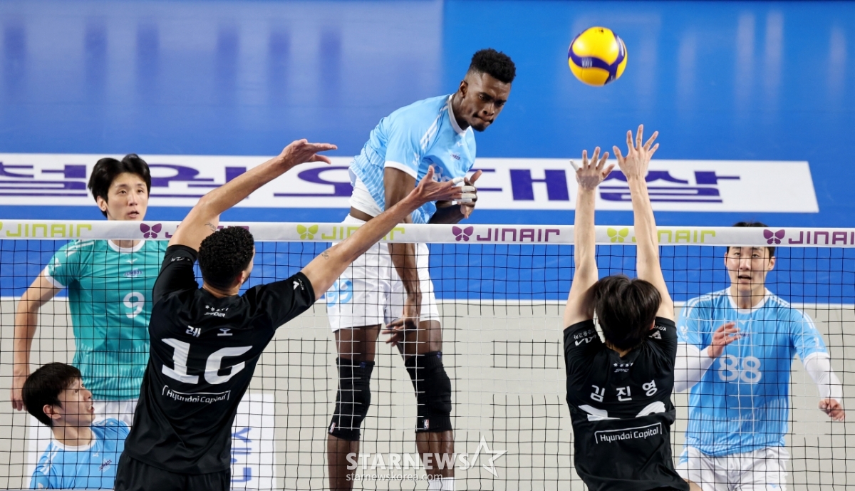 大韓航空のマッソが8日、天安(チョンアン)ユ·グァンスン体育館で行われたジンエアー2025-2026Vリーグチャンピオン決定戦の大韓航空と現代キャピタル第4戦で、現代二重ブロッキングに強打を試みている。 2026.04.08.