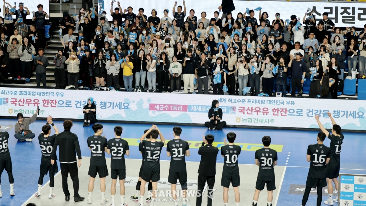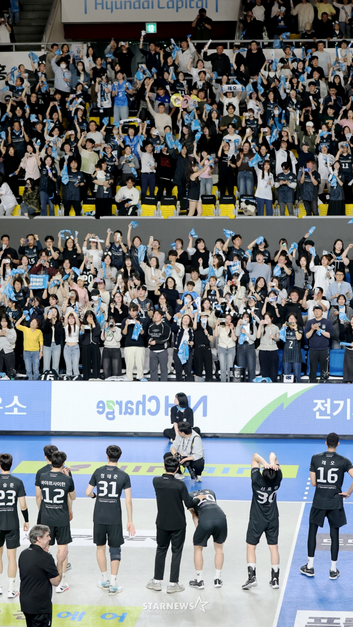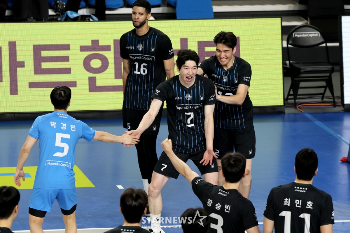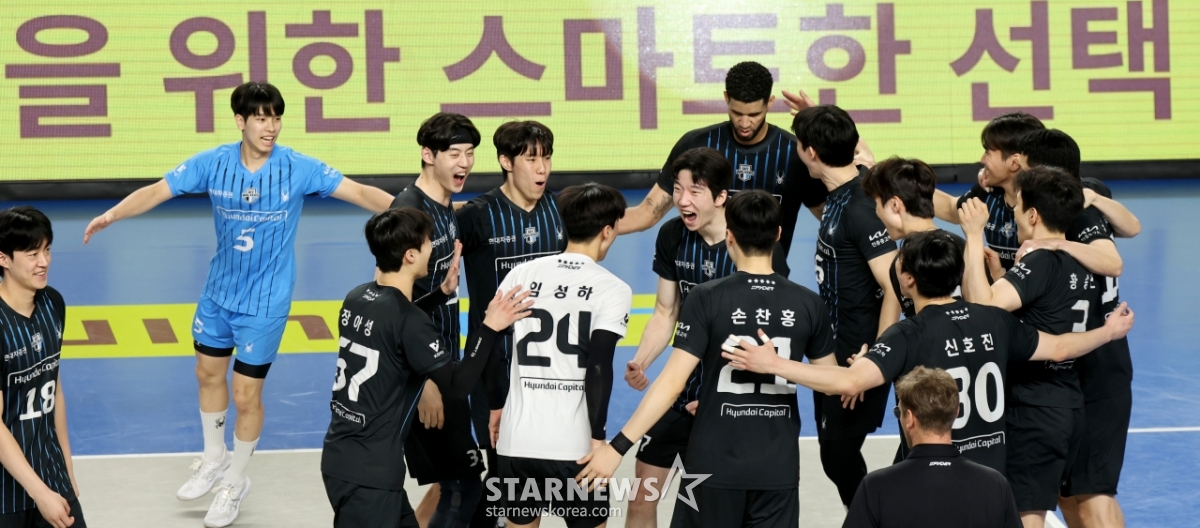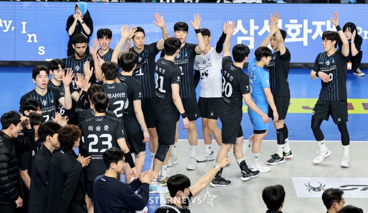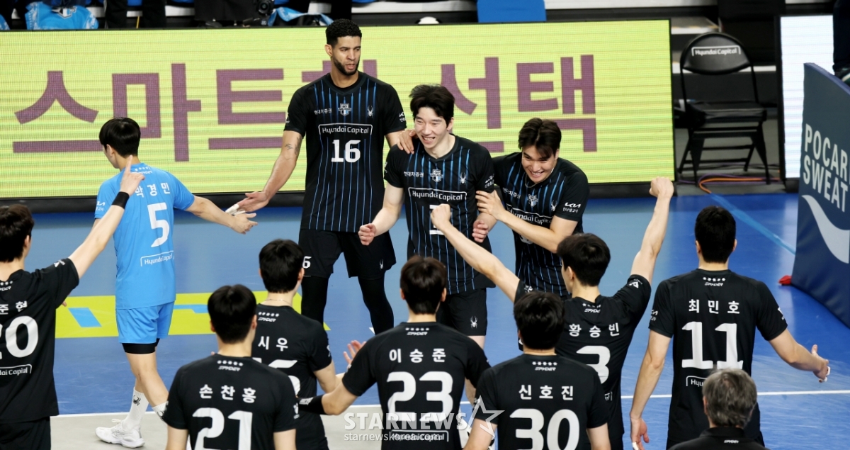 現代(ヒョンデ)レオが8日、天安(チョンアン)の柳寛順(ユ·グァンスン)体育館で行われたジンエアー2025-2026Vリーグチャンピオン決定戦の大韓航空と現代キャピタル第4戦の3セットマッチポイントを獲得している。 2026.04.08.