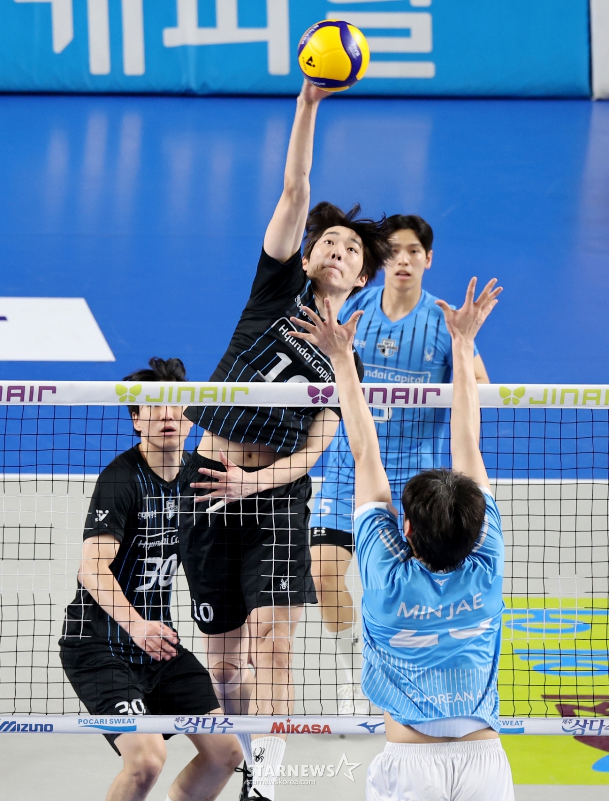 現代(ヒョンデ)の金ジンヨンが8日、天安(チョンアン)の柳寛順(ユ·グァンスン)体育館で行われたジンエアー2025-2026Vリーグチャンピオン決定戦の大韓航空と現代キャピタル第4戦で速攻を試みている。 2026.04.08.