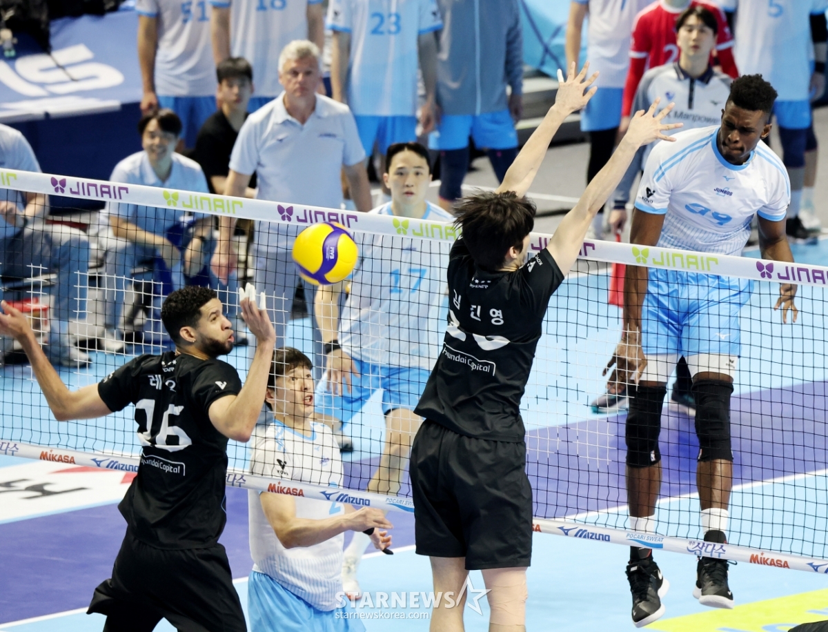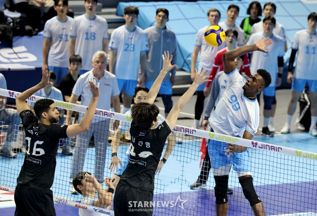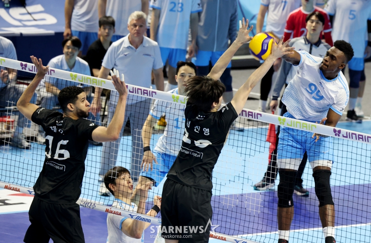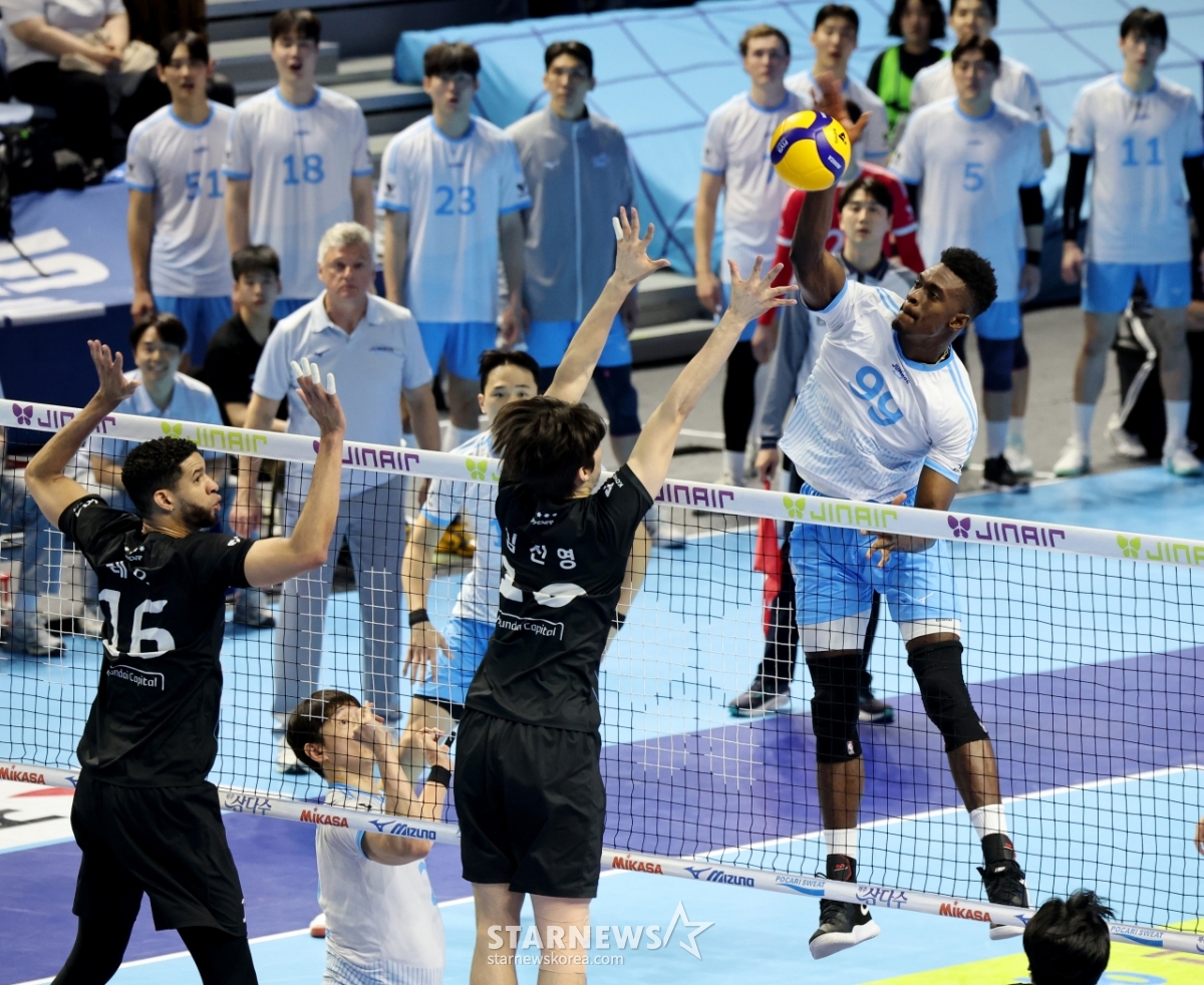 大韓航空のマッソが10日、仁川桂陽(インチョン·ケヤン)体育館で行われたジンエアー2025-2026Vリーグチャンピオン決定戦の大韓航空と現代(ヒョンデ)キャピタル第5戦で、レオ·キム·ジニョンのダブルブロッキングを引き離して攻撃を成功させている。 2026.04.10.