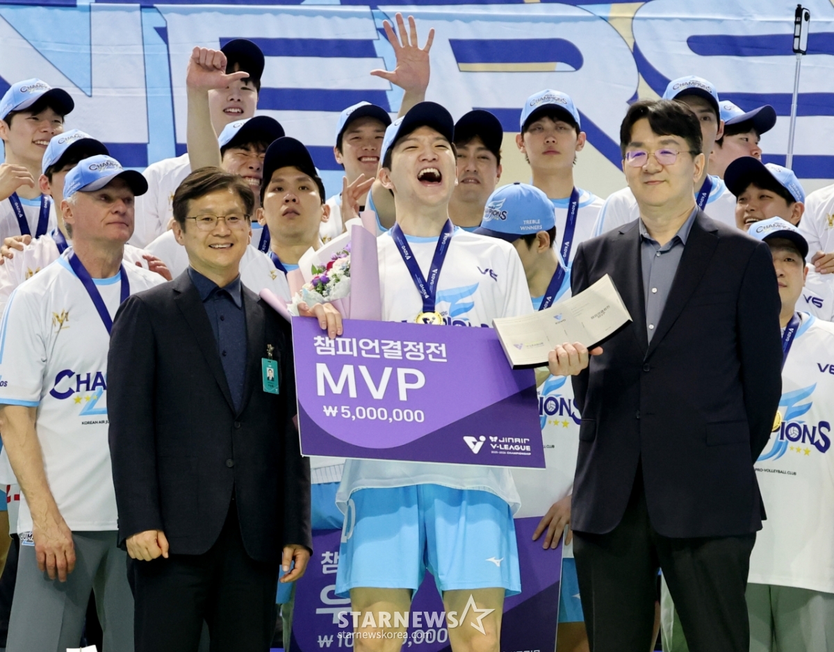MVPチョン·ジソクが10日、仁川桂陽体育館で開かれたジンエアー2025-2026Vリーグチャンピオン決定戦の大韓航空と現代キャピタル第5戦で勝利し、優勝した後、チョ·ウォンテKOVO総裁からトロフィーを受賞した後、記念撮影をしている。 2026.04.10.