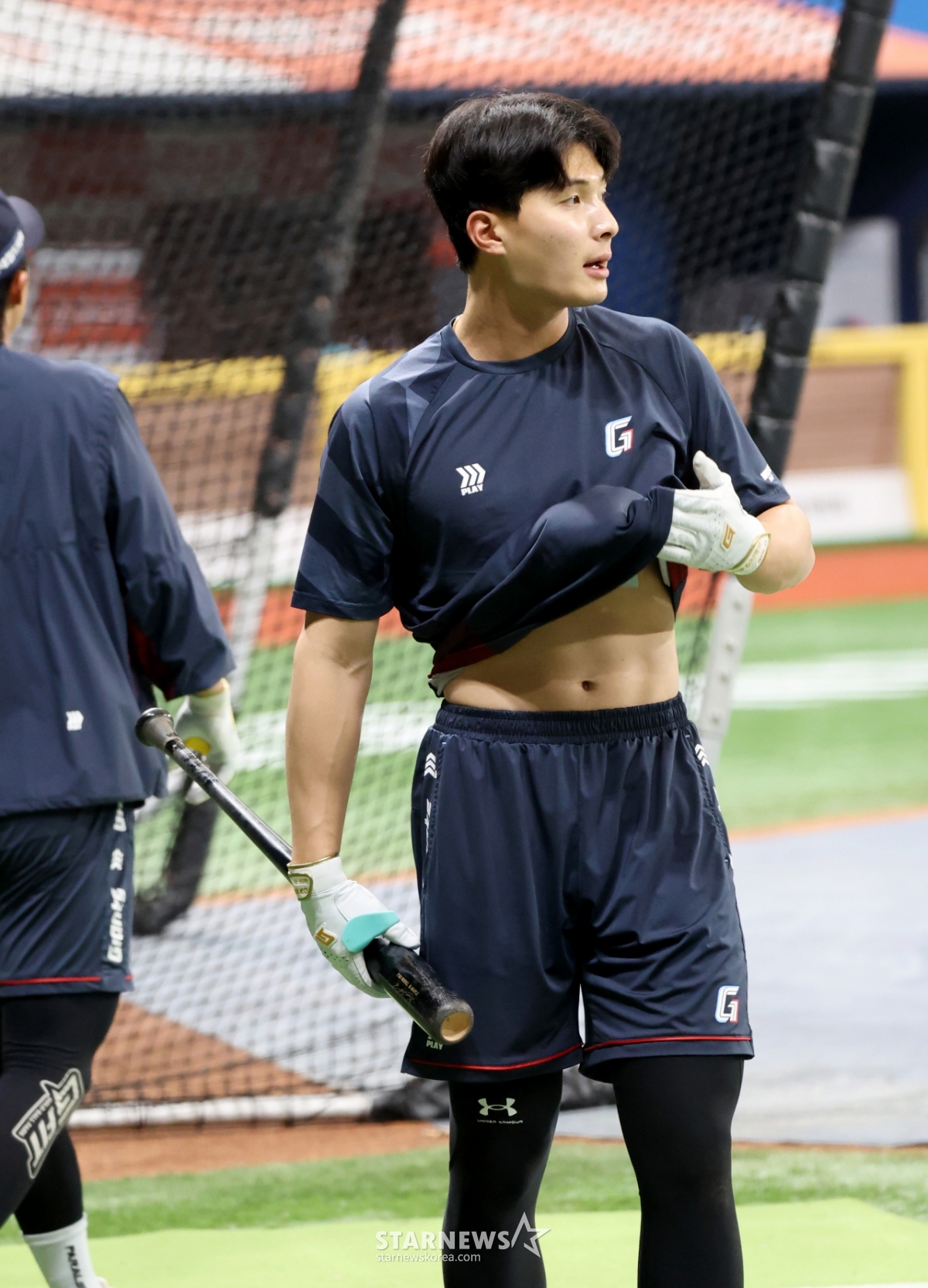ロッテのユン·ドンヒが12日、高尺スカイドームで開かれた2026KBOリーグのロッテジャイアンツとキウムヒーローズの試合を控え、バッティング練習をしていたところ、汗を拭いている。 2026.04.12.