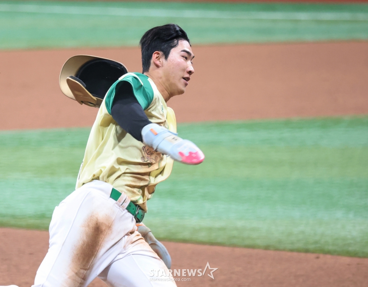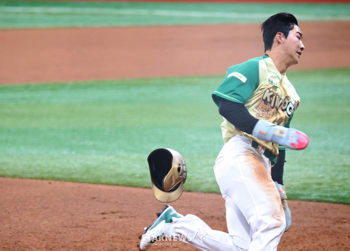 キウム1番打者のイ·ジュヒョンが12日、高尺スカイドームで開かれた2026KBOリーグロッテジャイアンツとキウムヒーローズの試合3回裏、2死1塁のアン·チハンの2塁打の時、ホームまで走って得点している.. 2026.04.12.