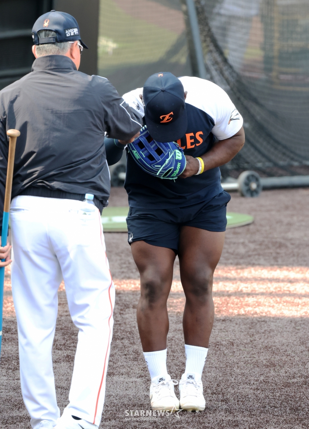 ハンファの金卿文(キム·ギョンムン)監督が15日、大田(テジョン)ハンファ生命ボールパークで行われる2026KBOリーグのハンファイーグルスと三星(サムスン)ライオンズの試合を控え、選手たちの練習を見守っている中、ペラザの挨拶を受けている。 2026.04.15.